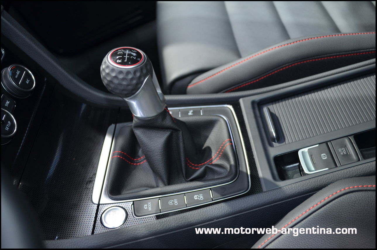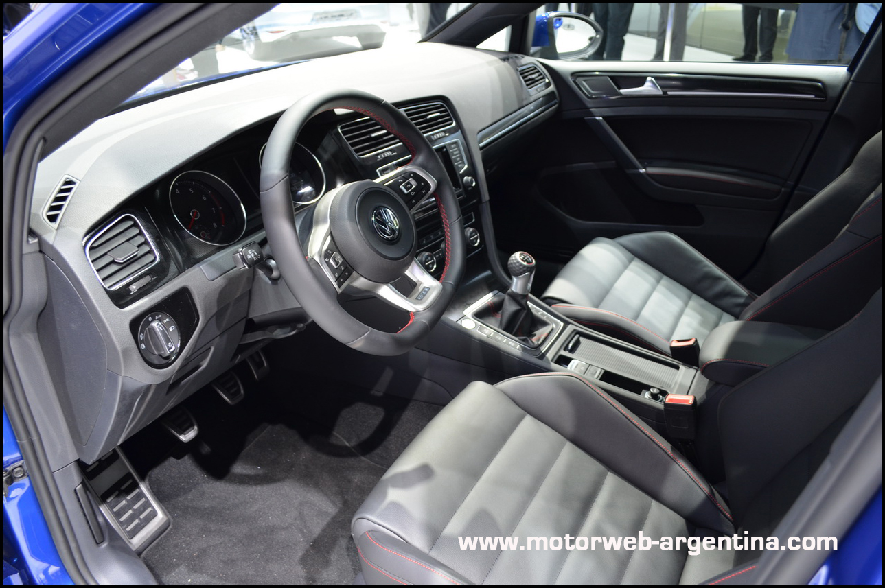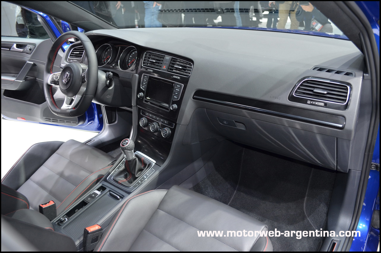 Interiores y equipamiento: El interior del Golf 7 es una clara y sutil evolución de su antecesor. Innova en que ya no se trata de una plancha recta y simétrica, como fue en el Golf 5 y en el 6, si no que la consola central está levemente orientada hacia el conductor. La disposición de los comandos es típica de los VW más actuales y nada queda fuera de la mano. Todos los comandos, teclas y levas son de nuevo diseño, son compartir nada con las generaciones anteriores. Hasta los pedales deportivos del GTI fueron renovados.
