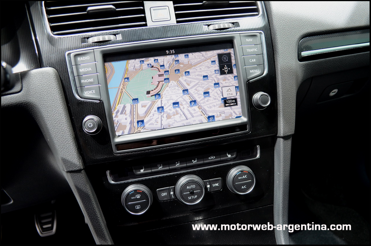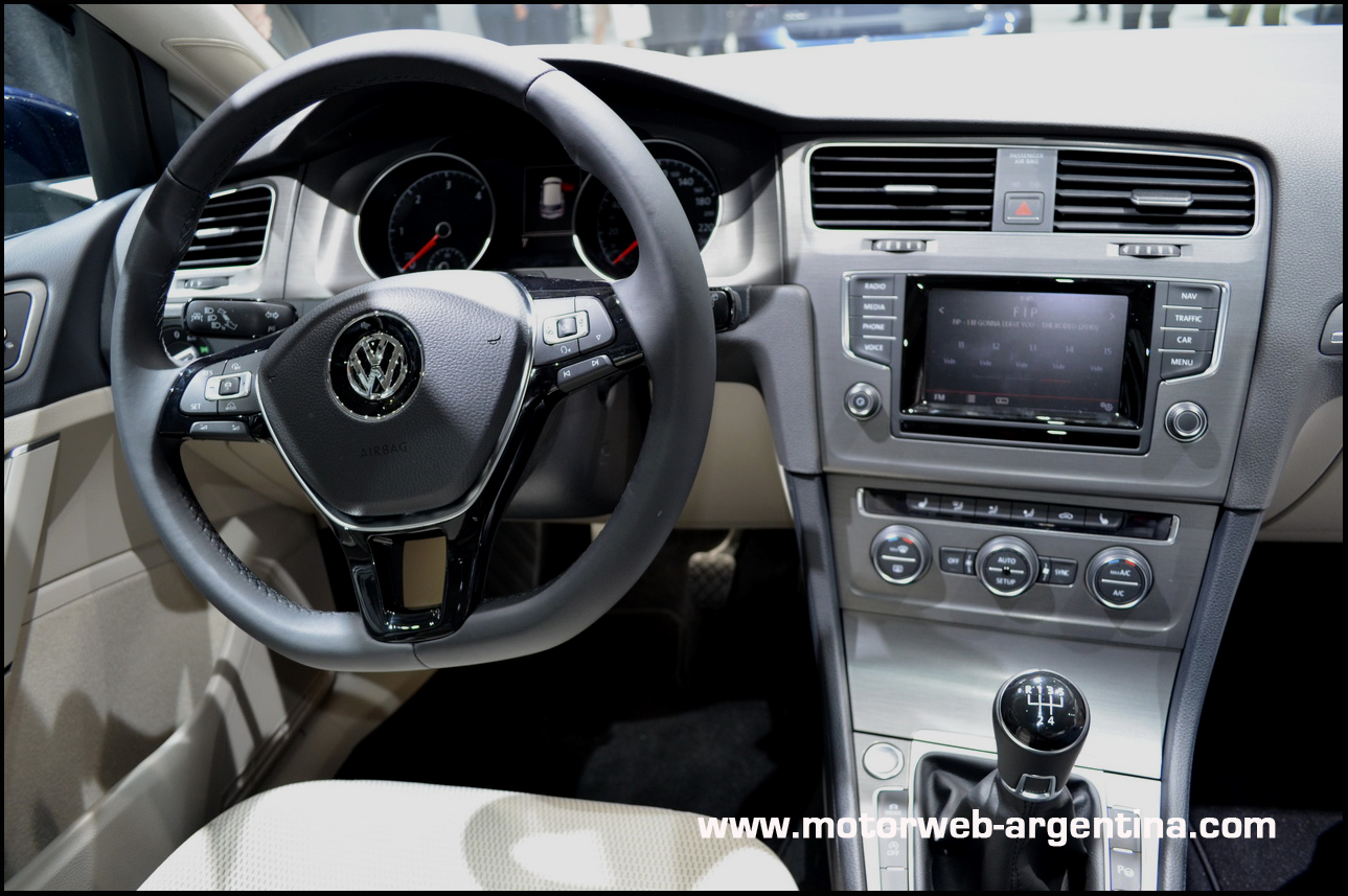 El freno de mano automático (con función Auto-Hold que hace que no sea necesario estar apretando siempre el freno en los semáforos cuando la caja es automática) es de serie en toda la gama Golf. La unidad de audio/multimedia es parte de una nueva familia de autoestereos desarrollados para esta nueva generación. Se trata de variantes de 5”, 5.8” y 8” según la versión y en los dos tamaños mas grande, el display es Multi-Touch, como en un Ipad, por ejemplo. Es decir que con los dedos podemos agrandar o achicar mapas del GPS, pasar de una pantalla a otra o navegar entre botones de funciones. La versión de 8 pulgadas incluye también lector de DVD. La gama de los sistemas de audio se llaman Composition Touch (5″ – monocromático , Composition Colour (5″ a color), Composition Media (5.8″ pantalla capacitiva), Discover Media (5.8 «, capacitivo y con navegador), Discover Pro (8», capacitivo, con DVD, memoria interna flash de 64Gb y actua como «Hot Spot» para celulares/tablets con WLAN).