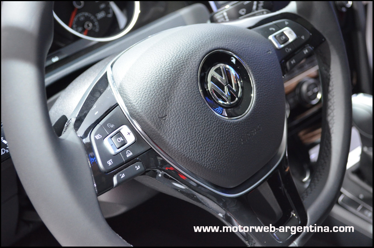 El volante cambia por un modelo más elegante, que en algunas versiones como la GTI tiene la base plana. La tapa del airbag es bien redondo y saliente en el GTI, con los tres radios del volante que se hunden hacia el centro del volante. En la versiones tranquilas, el centro es mas trapezoidal y con menos relieve. Con insertos en negro “piano”, incluyen el cruise-control (ya no más en la palanquita del guiño), el volumen del audio bien separado, el comando de la computadora de a bordo del lado derecho y también claramente separado las teclas para pasar los temas o las estaciones de radio. En esto ha ganado claridad de uso.