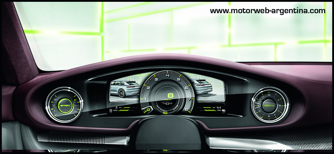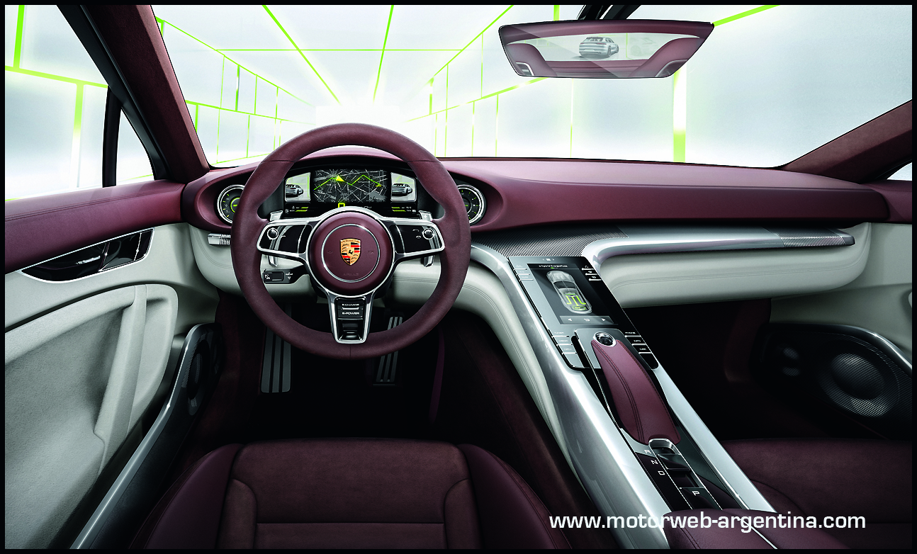 El Concept no tiene espejos retrovisores externos, y los reemplaza con dos displays a los extremos del clúster del tablero, reproduciendo allí lo que ven hacia atrás sendas cámaras externas. Todo está tenue mente iluminado en luces verde manzana, un tono elegido por Porsche para sus conceptos e-hybrid. También las pinzas de los frenos van pintadas en este mismo tono de verde, un guiño simpático hacia el espíritu «verde» de este desarrollo nuevo de Stuttgart, que mira hacia el futuro del automóvil deportivo.