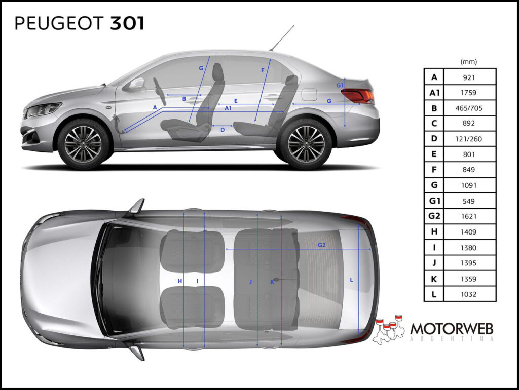 El nuevo Peugeot 301 utiliza la «Plataforma 1» del Grupo PSA (la misma del 208) con la maxima distancia entre ejes posible para la misma, llegando a 2,65 metros. El largo total es de 4,45 metros brindando estabilidad y buena habitabilidad interior para cinco ocupantes, con un ancho de 1.40 m. en la parte delantera. En las plazas traseras, el pasajero dispone de un espacio para las rodillas comprendido entre 12 y 26cm., dependiendo de la posición del asiento delantero.