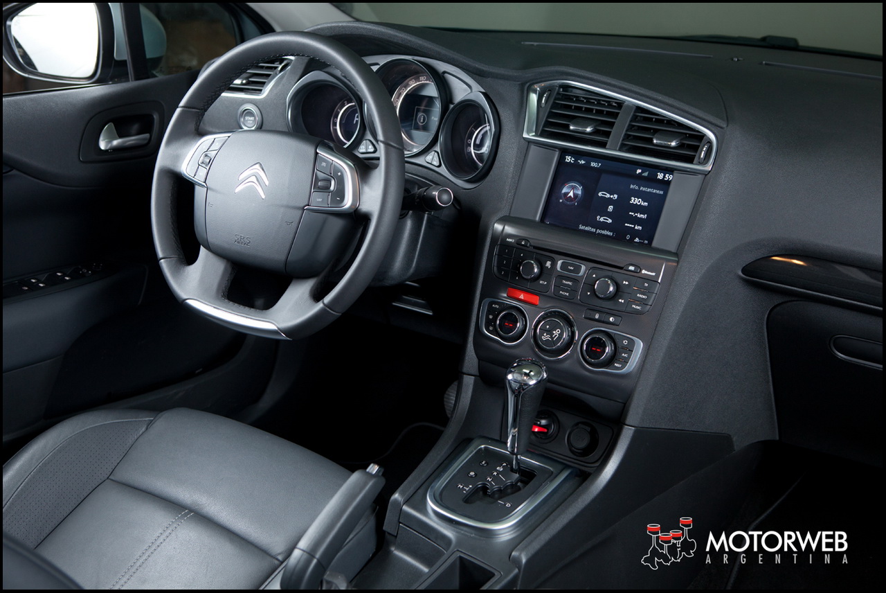 La posición de manejo es confortable, con múltiples regulaciones tanto de la butaca del conductor como del volante. Llama la atención, al igual que nos pasó con el Peugeot 408, que la butaca del acompañante no regule en altura y que se viaje allí bastante alto allí. Merecería una revisión. Todas las regulaciones de las butacas son manuales. Como decíamos, la posición de manejo es muy cómoda y para ello también colaboran las butacas, de buena forma y adecuada sujeción lateral. La tapicería tiene interesantes trabajos de texturas y diseño, que suman cierta sofisticación al interior, aunque se lucirían mas si hubiera opciones de interiores no 100% negros, solución tan característica de los productos Mercosur. Seguramente el mismo diseño de tapicerías en un tono marrón habano haría las delicias de los mas clientes mas exigentes, tal y como equipa la marca algunos de sus modelos europeos. El instrumental, que deje en el pasado el clúster central y desdoblado, es claro y legible, concentrado en tres grandes esferas y calcado del que trae el DS4 que probáramos hace un tiempo ya. Impecable la calidad de toda la pieza que conforma el tablero, de un inyectado bien texturado y muy mate, sin brillo, como nos gusta a nosotros. Todos los comandos están lógicamente distribuidos y a la mano y lo único que podemos criticarle es que la pantalla del navegador no sea táctil, si no que se opera con una ruedita, mucho menos rápido e intuitivo que poder usar directamente los dedos sobre la pantalla. Se entiende esta elección en el caso de lejanía física del display, pero en el Citroën C4 Lounge, donde está realmente a la mano, merecería una reformulación.