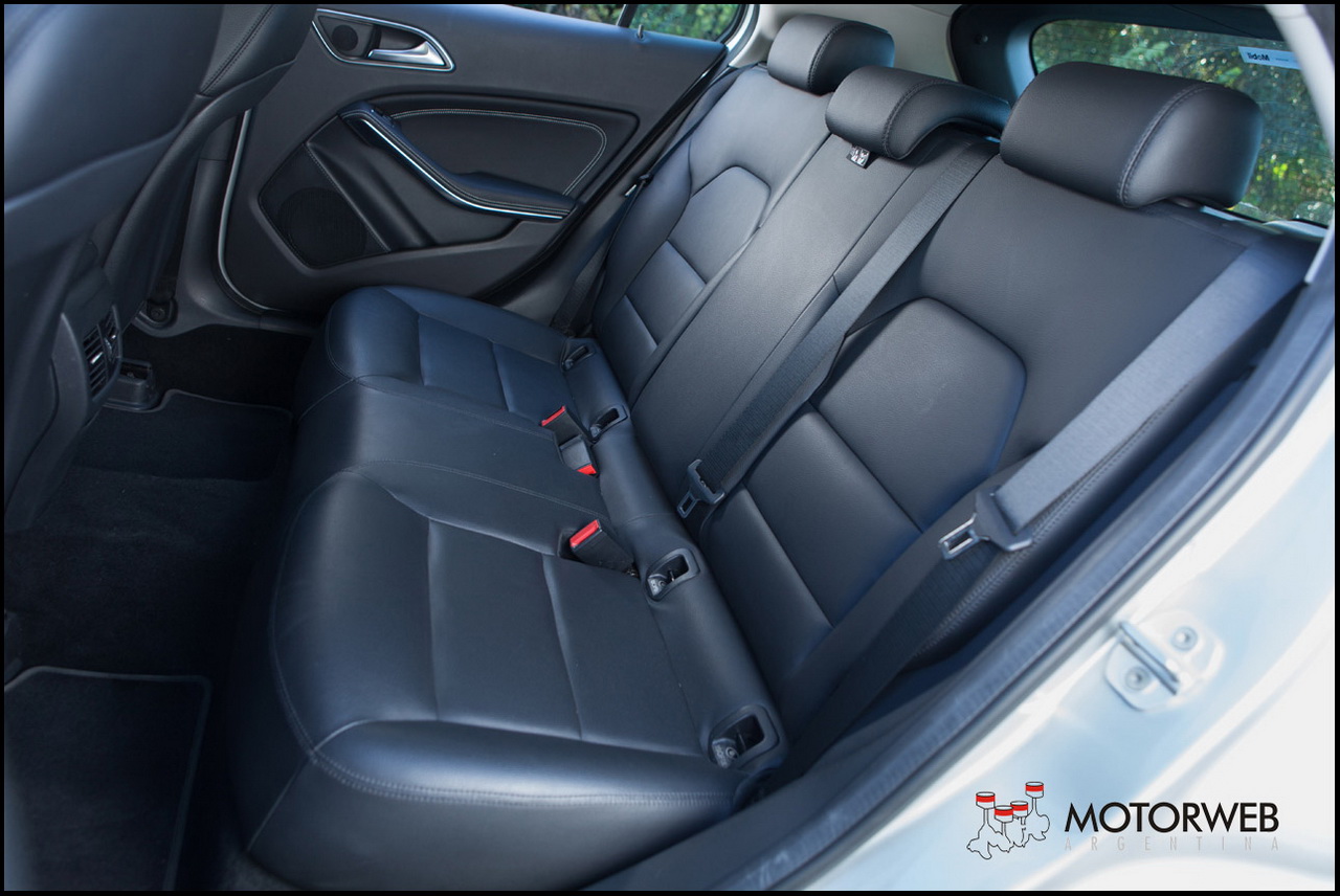 El habitáculo del GLA es casi calcado del Clase A. Misma plancha, mismas contrapuertas, aunque diferentes butacas delanteras. Es apenas un par de centímetros mas ancho adentro, casi imperceptible si no tenemos una cinta métrica en mano. En el caso de «nuestro» modelo de pruebas, estaba equipada las butacas delanteras con apoyacabezas separado del respaldo, regulables en altura, y muy diferentes a las vistosas butacas de los Clase A que probamos hace un tiempo (ver TEST). La posición de manejo es muy cómoda y se puede lograr gracias a múltiples regulaciones, incluyendo la de las butacas, que son ambas eléctricas y con tres memorias. Nos encantó la posición bien vertical del volante!