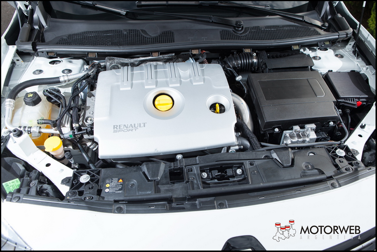 El motor, el 2.0 TCe (F4R) que conocimos cuando probamos el primer Fluence Sport en Noviembre de 2012 (ver prueba aquí), fue profundamente revisado. Este dos litros turbo ahora dispone de 190cv de potencia maxima a 5.500rpm. Son 10cv mas que la versión anterior. El torque máximo, se mantiene en notables 300Nm, pero a 2.250 rpm, y la caja de velocidades solo ofrece la opción de ser manual de 6 marchas.