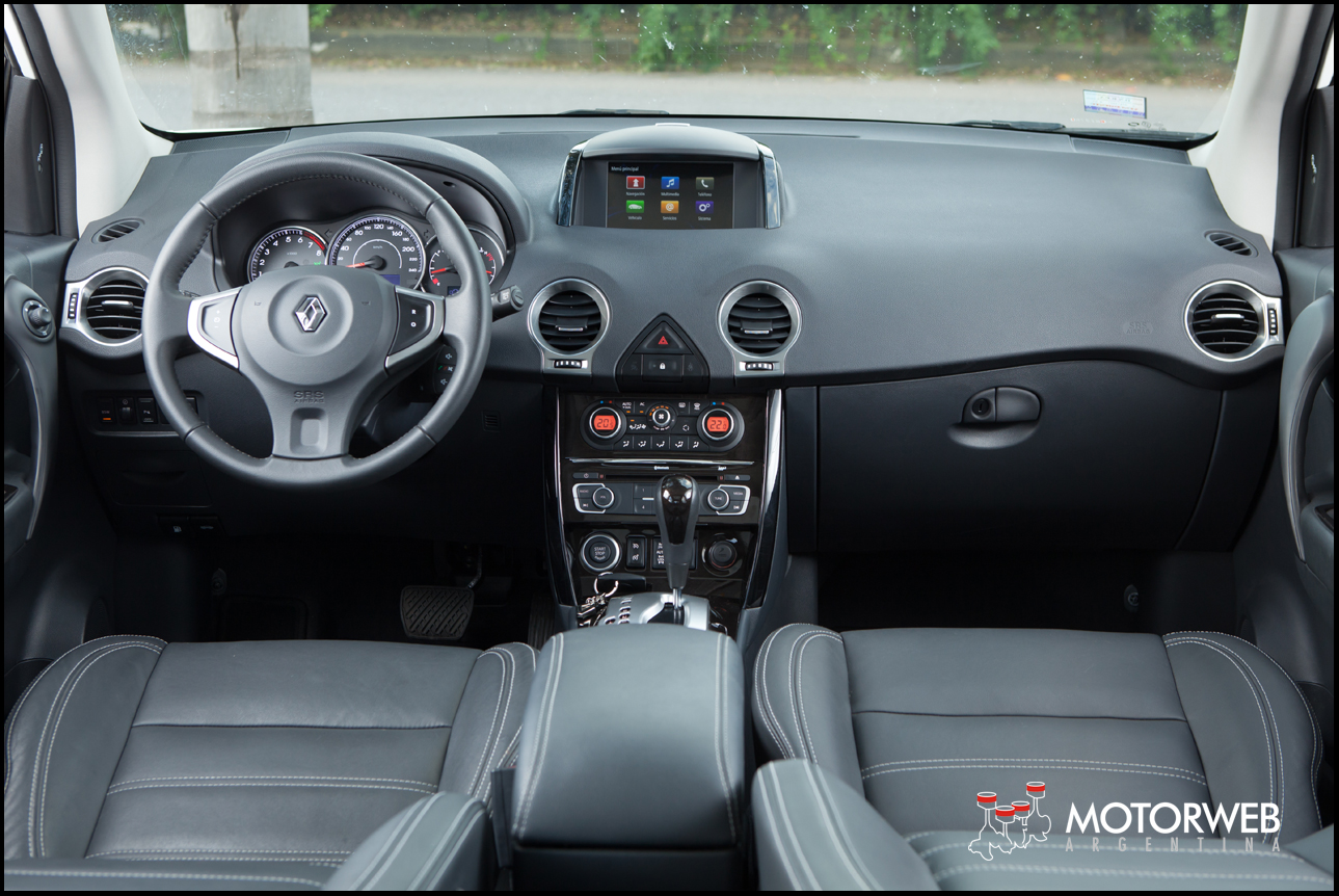 Suma navegador con GPS, cámara de retroceso, telefonía por Bluetooth, todo concentrado bajo el nuevo sistema de Renault llamado R-Link, que también se ofrece en Megane III y Fluence. Comandado desde un joystick con botones periféricos en el túnel central detrás de la selectora de cambios, su manejo es intuitivo y sencillo. No faltan en la lsita de equipamiento el encendido automático de luces y limpiaparabrisas, freno de mano eléctrico, el climatizador bizona con salidas cambien para las plazas traseras, arranque sin llave y por medio de un botón, y los sensores de estacionamiento sonoros delanteros y traseros, entre otras cosas. Tiene un amplio equipo de seguridad como son sus 6 airbags, frenos con ABS, EBD y EBA, controles de estabilidad y tracción, ganchos ISOfix traseros, faros delanteros de Bi-xenón con lavafaros, luces antinieblas delanteras y traseras, asistentes de partida en pendiente («HSA»), y de descenso, que regula el deslizamiento controlado del Koleos en bajadas hasta los 7 km/h.