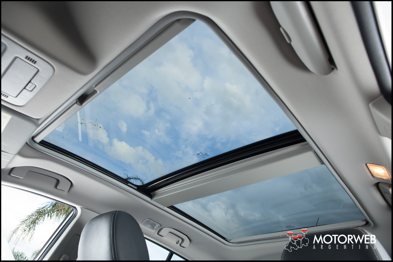 El habitáculo es luminoso gracias al amplio techo panorámico de dos paños de cristal, siendo el delantero ademas pivotante y corredizo. Llamada de atención para las cortinitas que lo cubren, primero por ser de una tela que bajo pleno rayo de sol dejan pasar el calor, y por ser de accionamiento manual. Lo que no resulta practico del accionamiento es que son dos tramos de cortina separados, y el del tramo trasero no queda a mano del conductor. Si alguien que iba en las plazas traseras te dejó la cortinita abierta al bajarse y de repente el sol del atardecer asoma por detrás, deberemos aguantarnos el sol o parar el Koleos, bajarnos y correr la cortina a mano desde las plazas traseras.