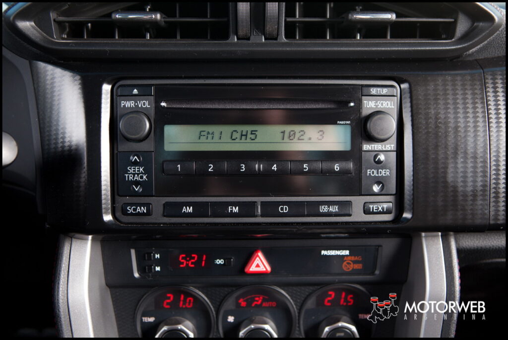 Entre otro detalle sutil del 86, es que la trama del aplique de toda la plancha, que a simple vista parecería una falsa fibra de carbono, es en realidad la repetición gráfica del centro del logo Toyota (sin el ovalo), dispuesto en múltiple repetición. Solo podríamos decir que fueron un poco lejos con la austeridad del interior al elegir el equipo de música que -al menos en las unidades para Argentina- parece sacado de una Hilux vieja y no a tono con el modelo que debe ser la perlita de la marca! Esto merece un tirón de orejas y minimanente podría llevar el estéreo táctil de Hilux, Camry o Prius!