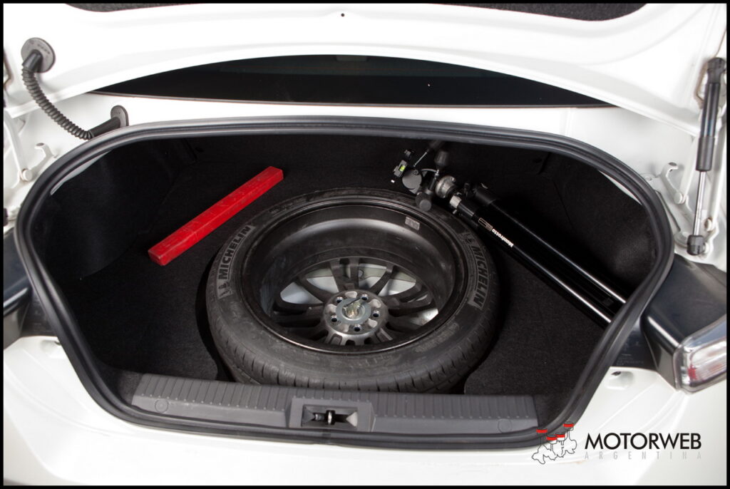 El baúl es pequeño, bastante pequeño con 247 litros, pero servirá para poner algún bolso para una escapada de a dos un fin de semana. Por si no alcanza, los respaldos traseros se rebaten. Y no entra mucho mas. En el piso del baúl, semi-encastrada y a la vista, está la rueda de auxilio, homogénea con las otras 4, como nos encanta a nosotros, misma llanta y mismo neumático.