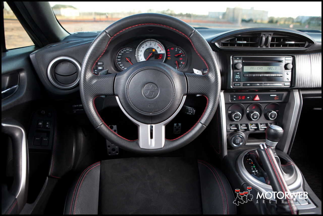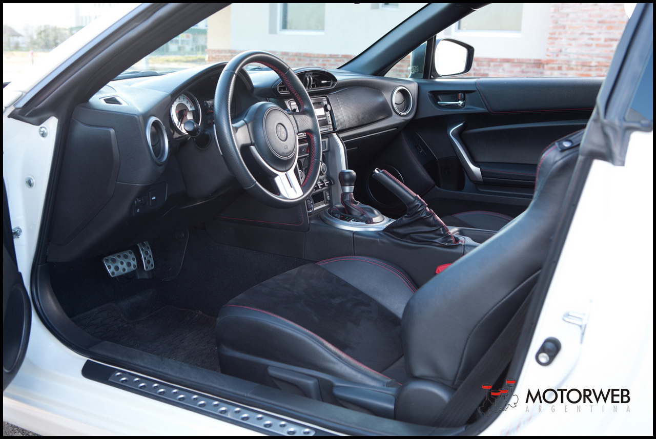 El interior es simple, espartano y racional. Bien japones. Sin demasiados «espejitos de colores», sin chiches que distraigan del mas puro placer de conducir y concentrarse al volante. Todo está preparado y orientado para el placer de la conducción. Es un auto egoísta. Las butacas, en cuero y alcántara, son de impecable sujeción, tapizadas en esta versión GT en cuero y alcántara, con costuras rojas a la vista.