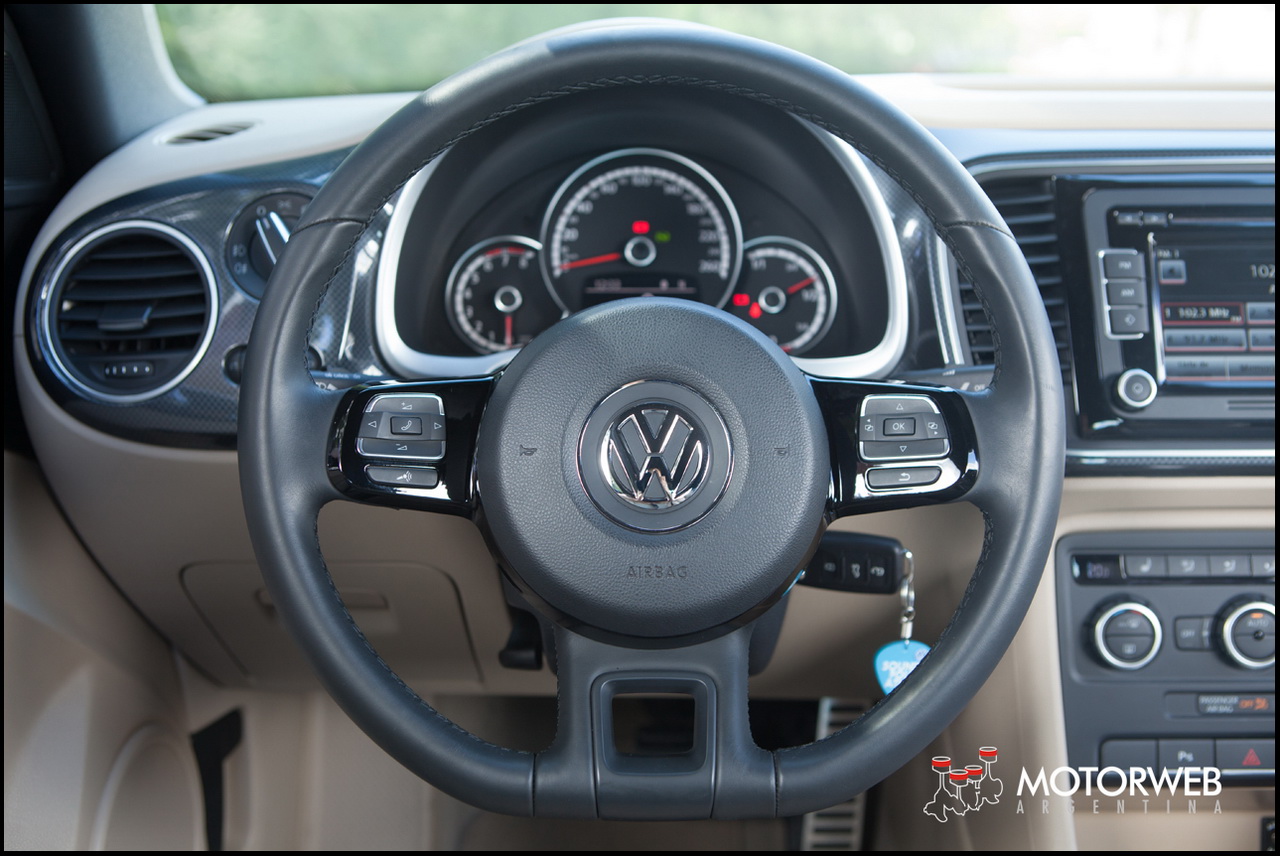 El cluster de los relojes es moderno y simétrico, concentrado en tres esferas superpuestas entre si, que me hicieron recordar – y disculpen el exabrupto- a como están superpuestos los relojes en los Porsche 911, solo que en vez de ser seis o siete elementos, aquí son solo tres. Y no es casualidad que el Beetle quiera «colgarse» de gestos o aires que recuerden al también mítico -y familiar lejano-, el 911.