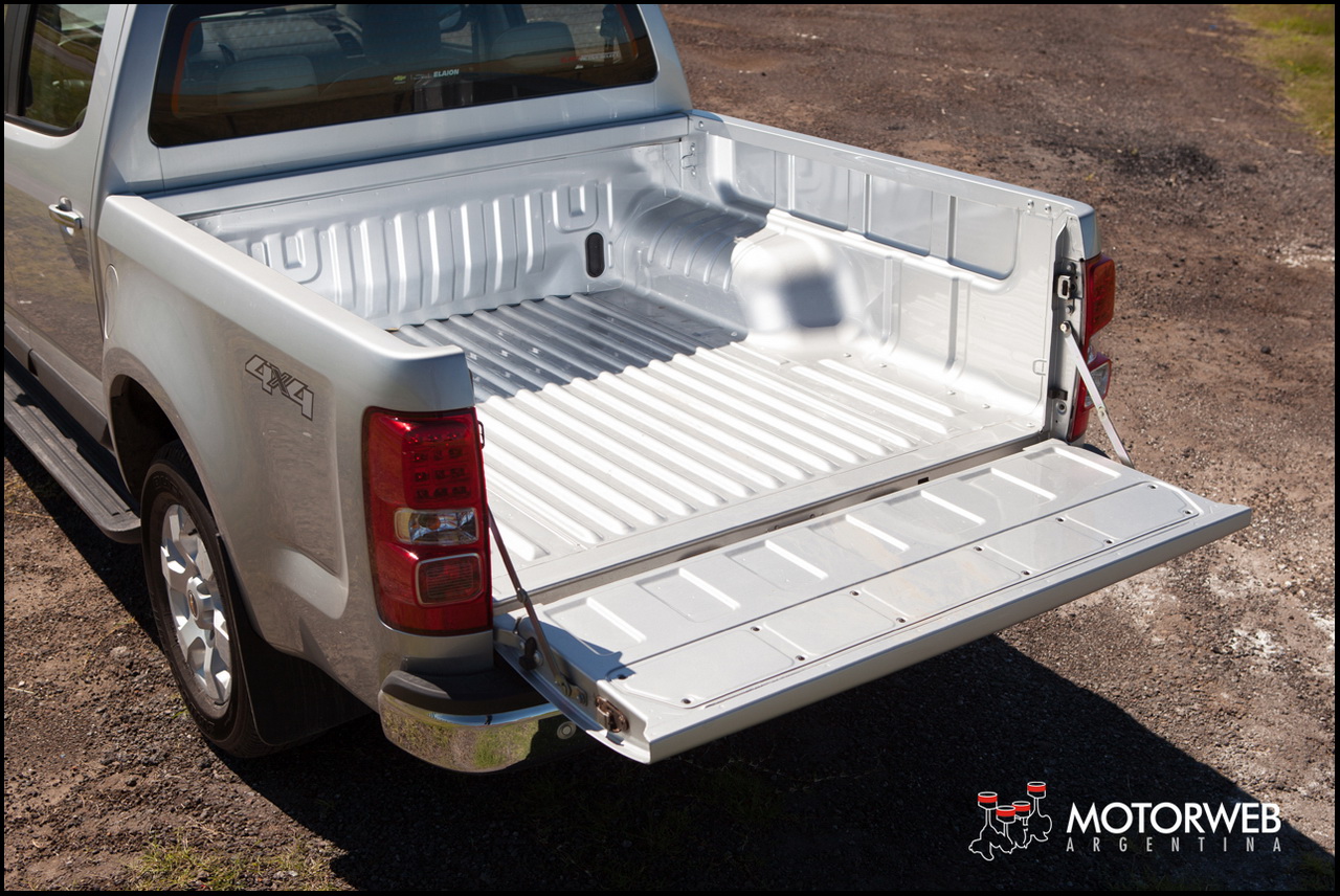 La caja de carga es regular y se entrega con la chapa pintada a la vista. El portón es pesado en su accionamiento y merecería un sistema de retención asistida para facilitar su uso. La capacidad de carga es de 1.017 Kilos, unos 139 Kilos menos que las variantes con tracción simple y caja de cambios manual. El precio de esta versión probada, la mas completa y equipada de la gama S10 con doble cabina, ya pasó el medio millón de Pesos. Su precio a Diciembre de 2014 es de $501.800, y su garantía es de 3 años o 100.000 kilómetros.