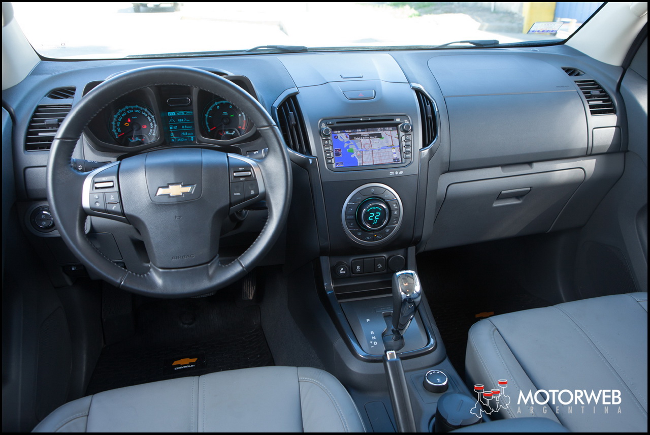 Buen volante, forrado en cuero y multifunción, y variedad de guanteras, portaobjetos y posavasos asegurarán largos viajes con comodidad. Si, en cambio, nos pareció que dado el tamaño de esta «chata» (mide casi 5.35 metros de largo y casi 1.89 de ancho), merecería, ademas de los sensores de estacionamiento acústicos traseros, unos delanteros. No es un item caro y bien podría ser parte de la buena dotación de confort de esta versión LTZ de la S10 doble cabina. Ademas, en la consola central, dominan con su presencia la generosa pantalla tactil del equipo multimedia y el climatizador de una zona.