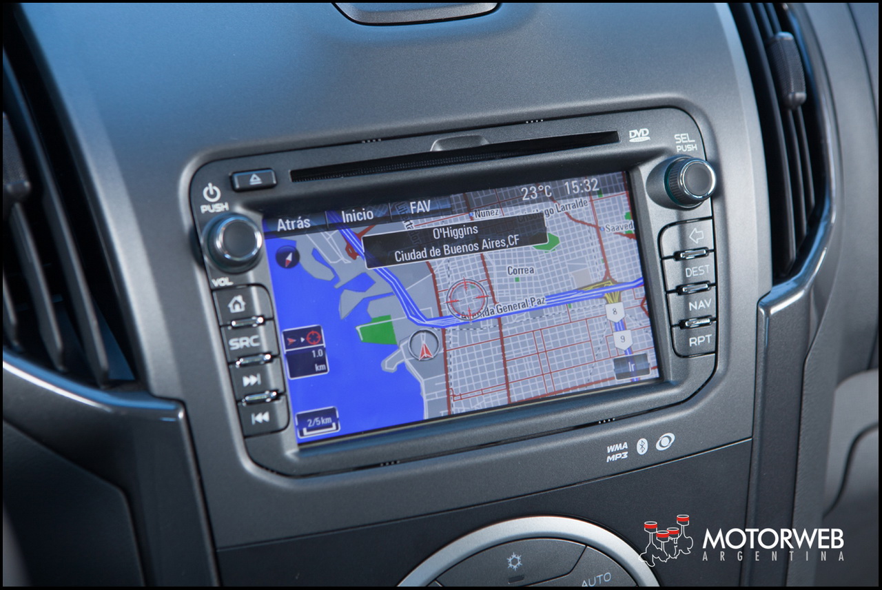 Arriba del «clima», tenemos el equipo multimedia. Completísimo y hasta con reproductor de DVDs. Tiene pantalla de 7 pulgadas, es táctil, que muestra el navegador GPS y tiene conexión Bluetooth. Podría también sumar cámara de marcha atrás, que no tiene. Si en cambio ofrece control de velocidad crucero, espejos retrovisores rebatibles eléctricamente (algo muy útil en un vehículo tan ancho al tener que maniobrar en espacio estrechos), y tapizados en cuero.