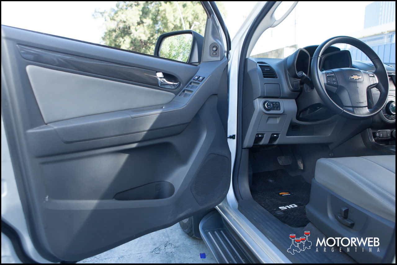 El interior de la Chevrolet S10 es simple y funcional, como debe ser una pickup. Ambientado en tonos claros, que el confieren luminosidad y calidez, el habitáculo es espacioso y cómodo. La plancha es de dos tonos, e incluye una tercera textura para la consola central. Nos pareció que tanto en contrapuertas como en la parte inferior de la plancha podrían tener mejores plásticos, con encastres mas cuidados y mejor vista. Dado el precio de este tipo de vehículos, no vemos de buen ojo que nos ofrezca las mismas texturas que encontramos en un Agile o un Onix, vehículos que cuestan hasta un tercio de lo que vale una S10. No es el caso de decir que los plasticos están mal encastrados como para causar ruidos parasitos, es mas bien un tema de visuales y texturas que podría estar mas cuidado.