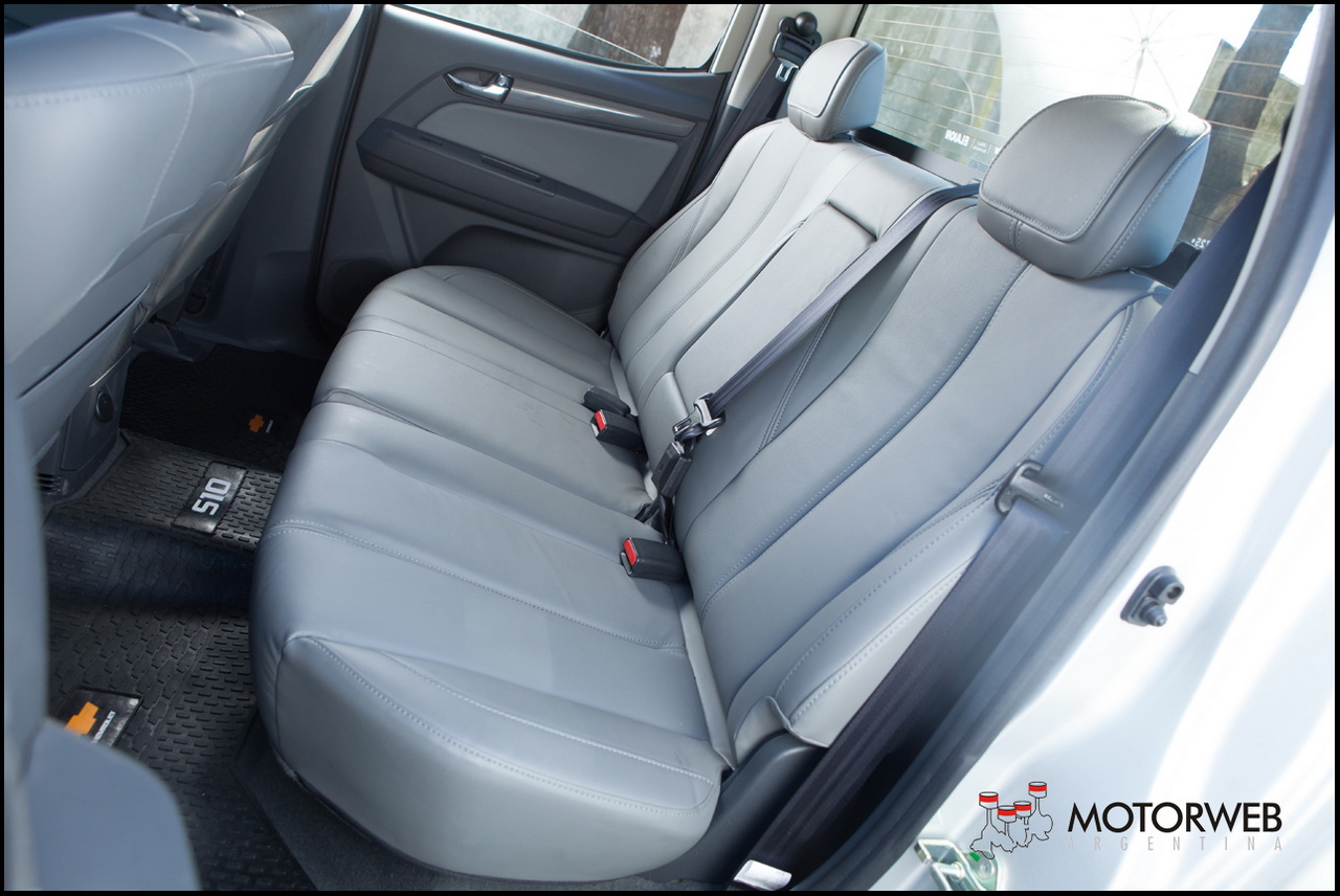 Las plazas traseras son confortables, pero pese a que el piso es bastante plano en el centro, no está del todo contempleado un tercer pasajero en el medio. Entre la falta del quinto apoyacabezas y el apoyabrazos central rebatible embutido en el respaldo, que pasajero que viaje al medio atrás será el que menos cómodo de todos viaje. El sistema de plegado del asiento trasero, para elevar la banqueta y poder llevar alguna carga dentro de la cabina, es simple y efectivo, y muy similar al que utilizan las demás pick-ups. Al subir el cojín, aparecen dos nichos de guardado, uno alfombrado y libre y el otro, sin demasiado esmero en la terminación y presentación, donde van, bien a mano, el criquet y las herramientas para cambiar una rueda.