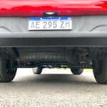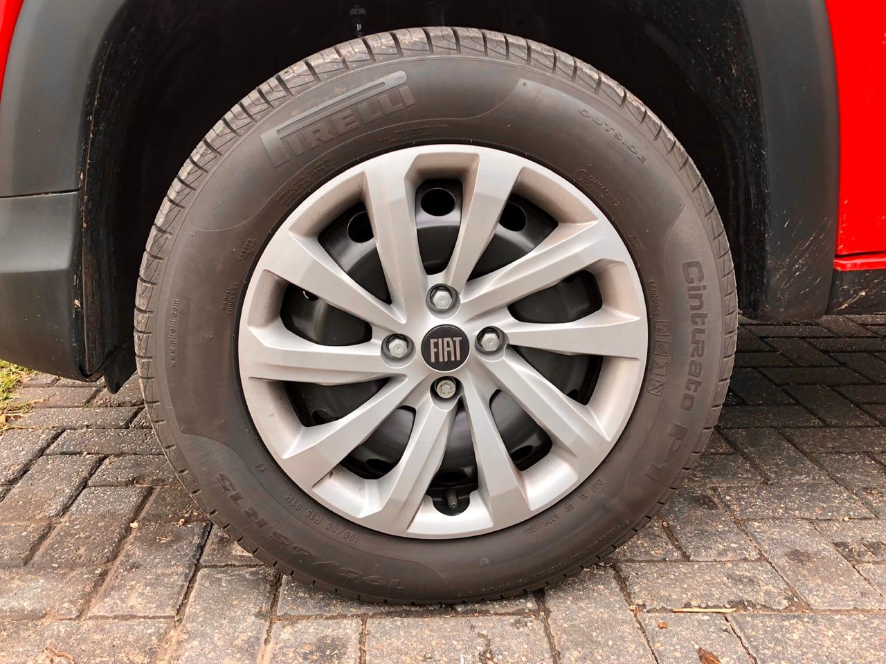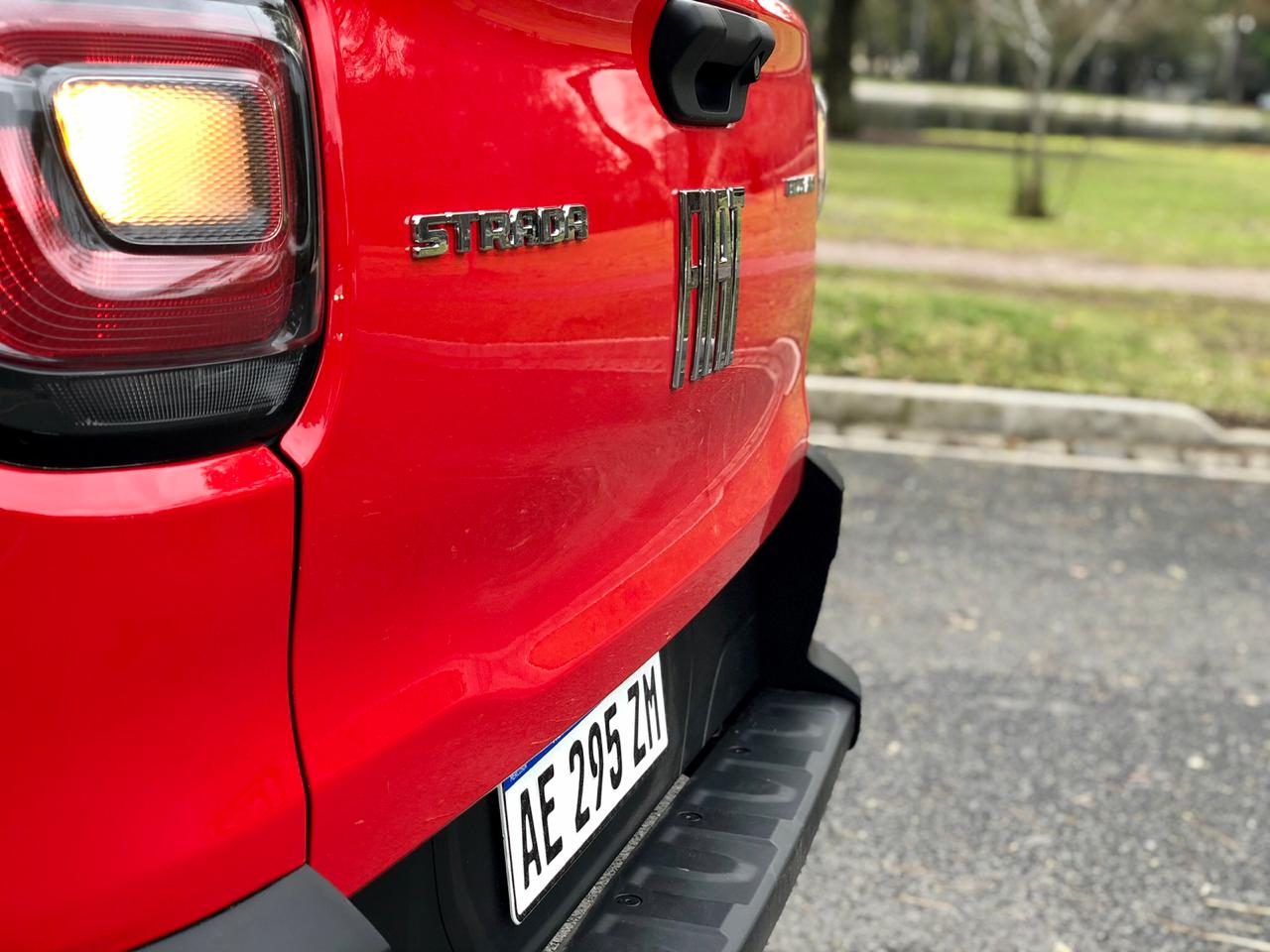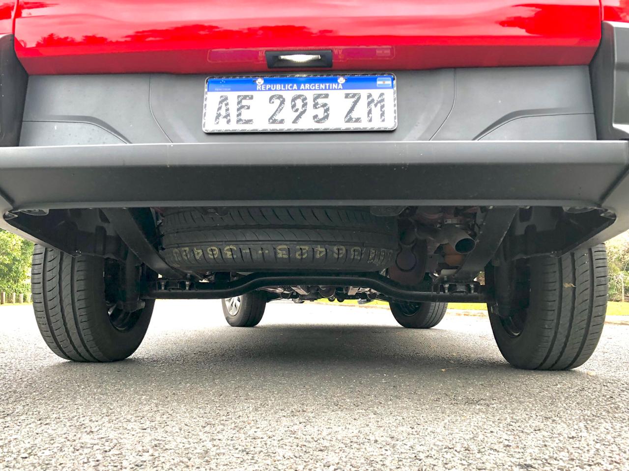 Nada del frontal es compartido con el Mobi. Emplea el tren delantero del Cronos y que transmite solidez, como así también una mayor sensación de compresión. El eje trasero rígido es asistido con elásticos longitudinales, transmitiendo ese andar firme y algo saltarín sin carga, típico en la Strada, y también de las pick-ups con esta configuración. Por otra parte, se reubicó la rueda de auxilio, que ahora pasa a estar bajo chasis.