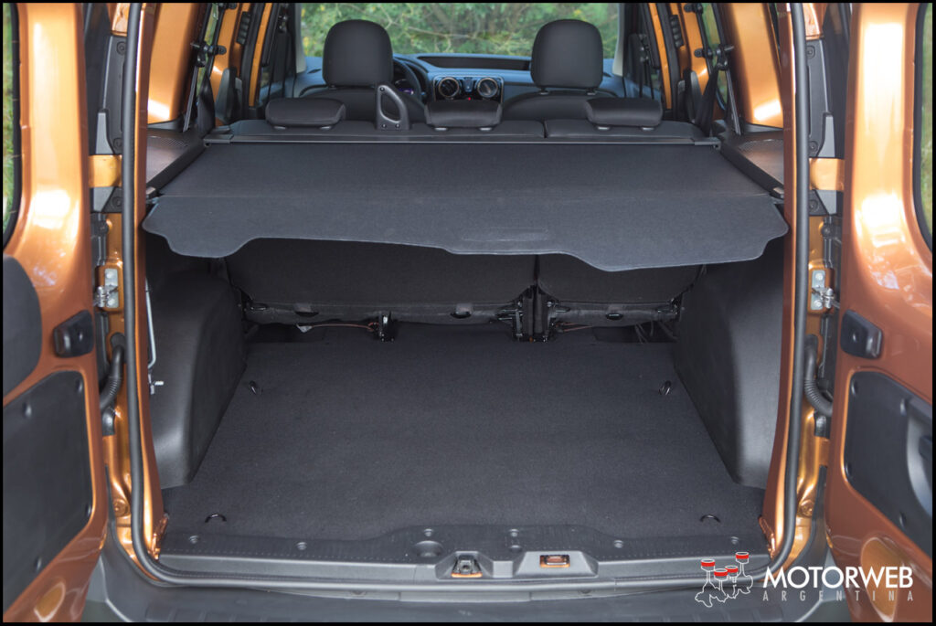 Las butacas traseras son rebatibles en partes asimétricas, o bien 2/3 detrás del conductor, o bien solo 1/3 detrás del acompañante. El sistema es simple y deja despejado un gran piso trasero plano con capacidad de 1,57 m de largo y 3 metros cúbicos de volumen útil. Con los asientos en modo normal y 5 personas sentadas, queda aún un generoso baúl de 800 litros! Sin dudas uno de los mejores aspectos del nuevo Kangoo.