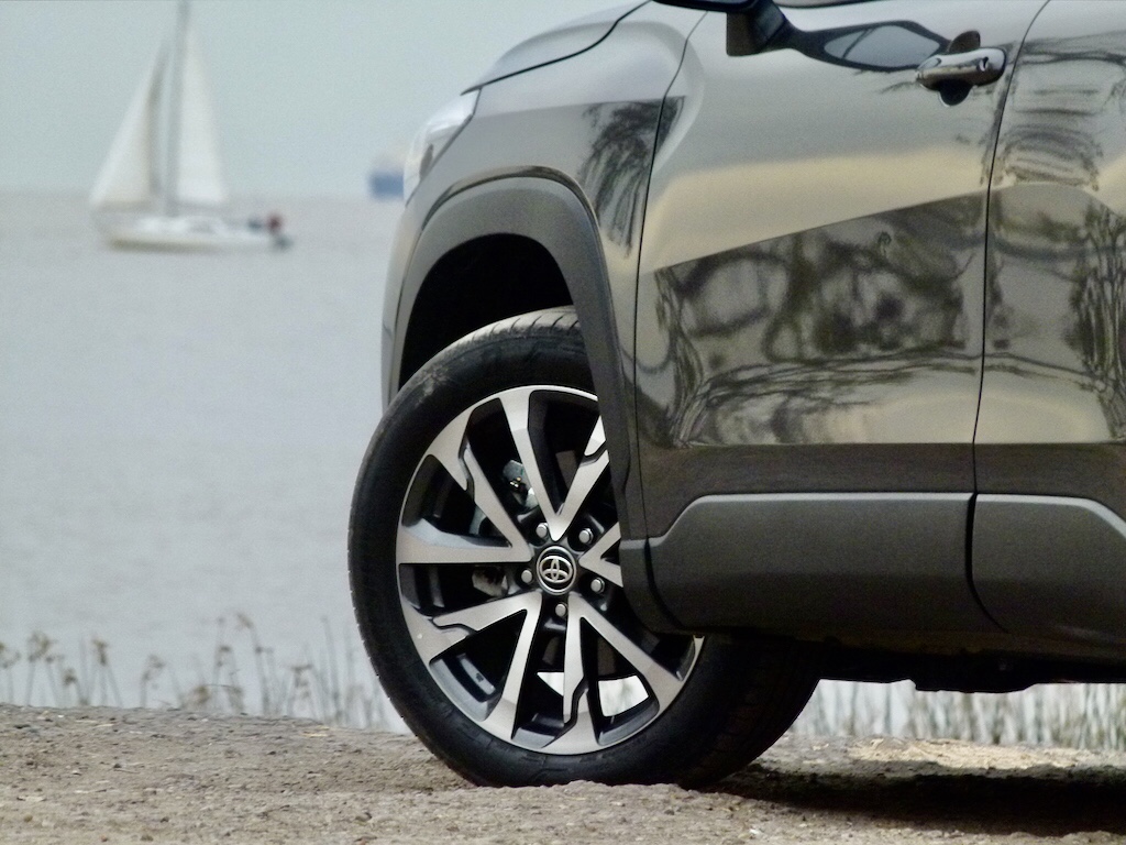 Los pasos de ruedas remarcados por fenders de plástico negro, o las luces con tecnología Full LED le dan un toque moderno, y bien SUV. Eso sí, para favorecer la capacidad de baúl y probablemente reducir costos, Toyota optó por incorporar un eje trasero semi-independiente, diferente al esquema multibrazo de su hermano. La rueda de auxilio es también temporal. Las llantas titulares tienen diámetro de 18 pulgadas, con un diseño bastante atractivo.