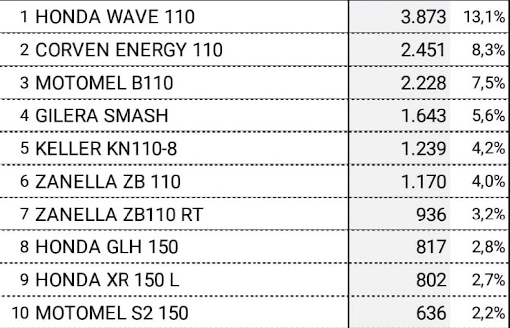 El primer escalón lo ocupa la Honda Wave 110, histórica líder de años anteriores que había caído a la cuarta posición, pero se recuperó. Le sigue la Corven Energy 110, que sube un escalón y supera a la Motomel B110, que en octubre quedó tercera. Cuarta se ubicó la Gilera Smash, que lideró durante gran parte del año pasado y quinta la Keller KN 110-8, que estaba en la sexta posición hace cuatro meses.