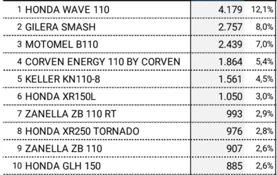 No se observan cambios en cuanto al modelo más patentado con respecto a agosto. La Honda Wave 110, histórica líder de años anteriores, sigue firme en la primera posición, seguida por la Gilera Smash, que había subido dos posiciones en agosto, y la Motomel B110 sigue en el tercer lugar.