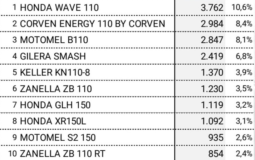 Por otra parte, señalaron que prácticamente sin cambios en cuanto al modelo más patentado. Sigue liderando cómodamente la Honda Wave 110, histórica líder de años anteriores, segunda está la Corven Energy 110, en tercer escalón la Motomel B110, seguida por la Gilera Smash y cierra los primeros cinco puestos de febrero, la Keller KN 110-8.