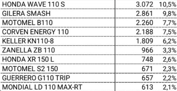 En cuanto al modelo más patentado, la Honda Wave 110S, recupera su histórico liderazgo por segundo mes. Fue luego de seis meses de haberlo pedido por la Gilera Smash, que por segunda vez en el año quedó segunda. La Motomel B110 recupera la tercera posición luego de haberla perdido el mes pasado por la Corven Energy 110, que ahora esta cuarta. El quinto puesto, sin cambios, sigue ocupado por la Keller KN 110-8.