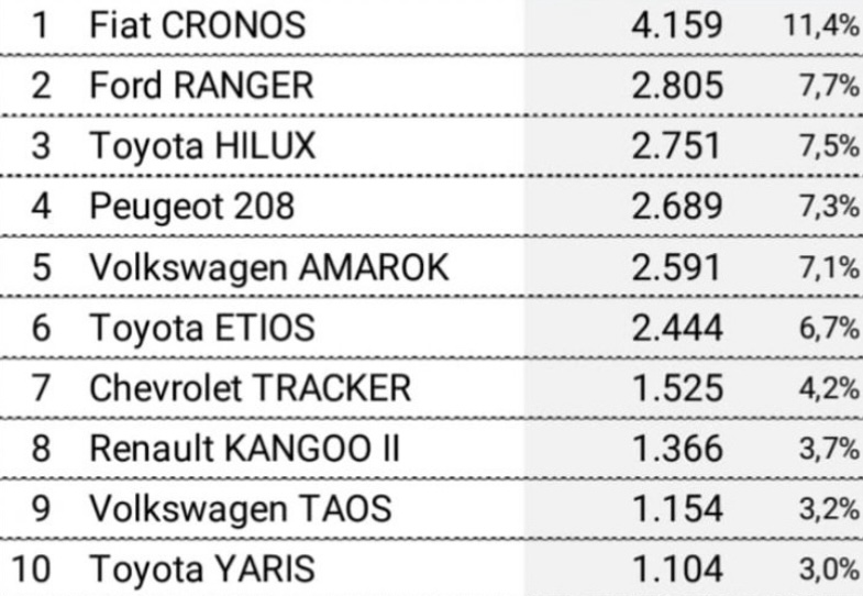 Luego aparece el Peugeot 208, Volkswagen Amarok, Toyota Etios, Chevrolet Tracker, Renault Kangoo, Volkswagen Taos y Toyota Yaris. Es claro ya que de los primeros 10, 8 de ellos son nacionales. Es decir, cada vez se siente más las trabas a las importaciones.