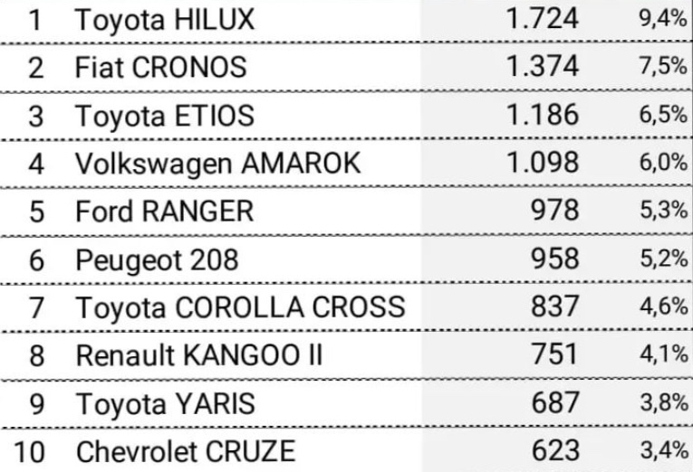 Los cinco modelos más vendidos luego del Fiat Cronos fueron el Peugeot 208 que se produce en la planta bonaerense de El Palomar y la pick-up Toyota Hilux, que sale de la terminal de Zárate. Luego, la Volkswagen Amarok, que se fabrica en General Pacheco. Y el Toyota Etios, el primer importado de la lista que proviene de Brasil.