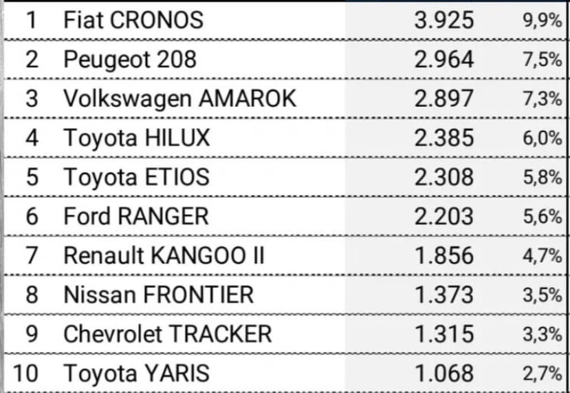 El ranking de los modelos más elegidos este mes por los argentinos volvió a estar encabezado por el Fiat Cronos. Totalizó 3.925 unidades patentadas y representó el 9,9% de participación de mercado.