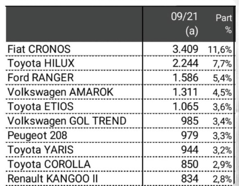 Además, se pueden ver varios cambios con respecto a agosto pasado. Si bien el Fiat Cronos sigue como líder tuvo una leve baja. Al revés pasó con la Toyota Hilux, que continúa segunda pero con un alza. La Ford Ranger avanzó un escalón y ahora está en el podio.