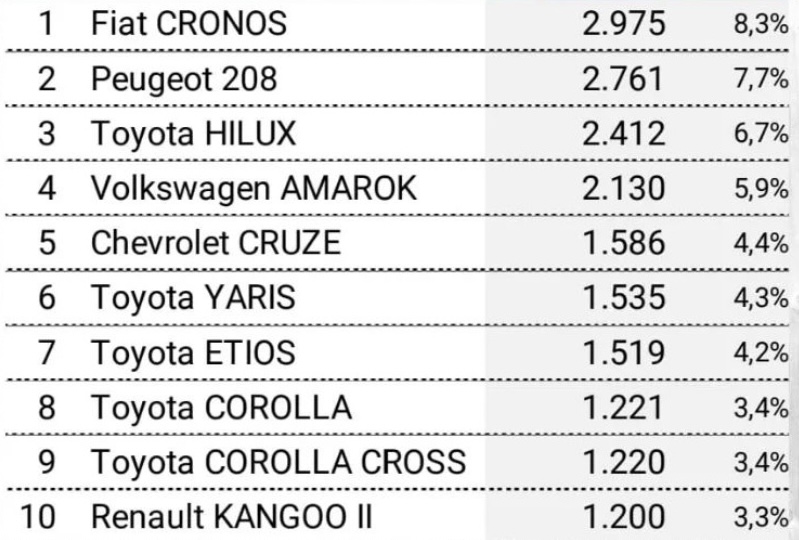 En cuanto a la venta de 0Km en julio por modelo, el Fiat Cronos continúa como claro líder con 2.975 unidades, lo que representa el 8,3% del total. Luego sigue el Peugeot 208 con 2.761 y Toyota Hilux con 2.412. El cuarto y quinto lugar también es para dos argentinos: Volkswagen Amarok y Chevrolet Cruze.