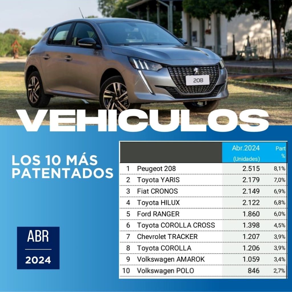 Los autos más vendidos de abril fueron el Peugeot 208 con 2.515 unidades, el Toyota Yaris con 2.179 y el Fiat Cronos con 2.149. Muy cerca de estos tres autos livianos, se ubicaron dos pick-ups, la Toyota Hilux con 2.122 unidades vendidas y la Ford Ranger con 1.860 unidades.