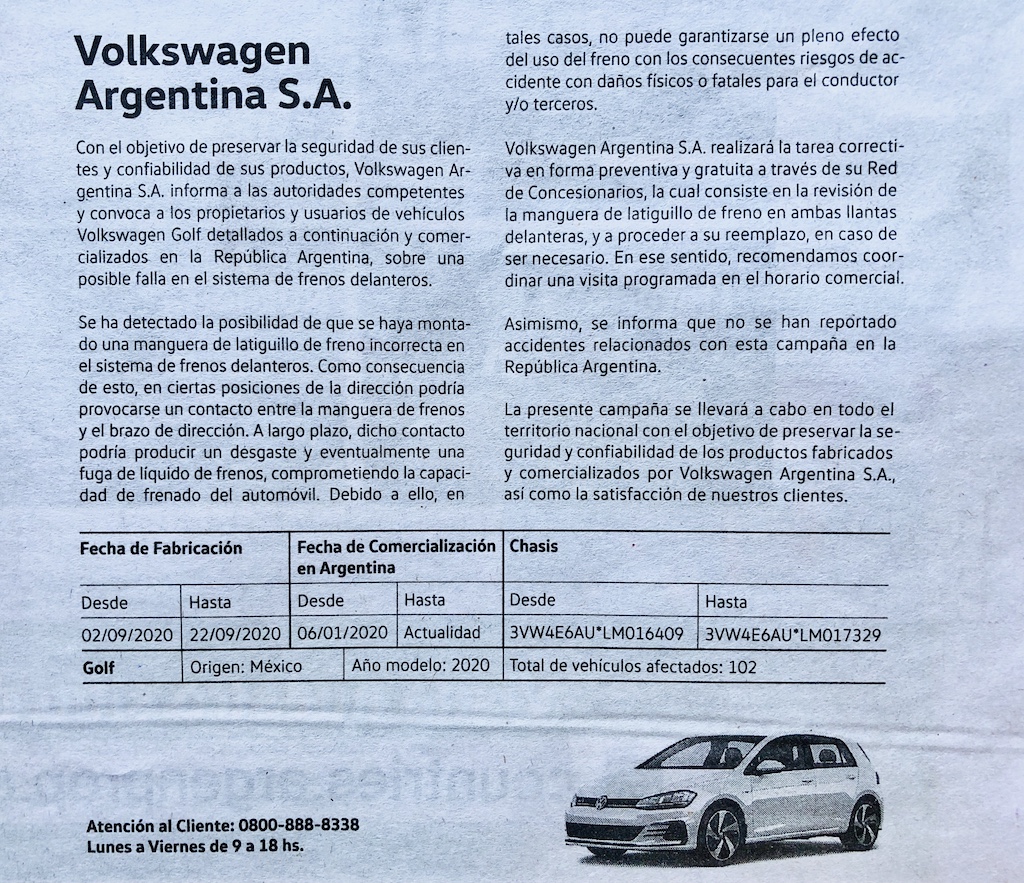 Volkswagen Argentina convocó a propietarios de Golf porque detectó una posible falla en el sistema de frenos delanteros. Se trata de 102 unidades fabricadas en México y comercializadas en 2020. Según informó a través de avisos en los diarios, se puede dar la posibilidad de que se haya montado una manguera de latiguillo de freno incorrecta en el sistema de frenos delanteros.