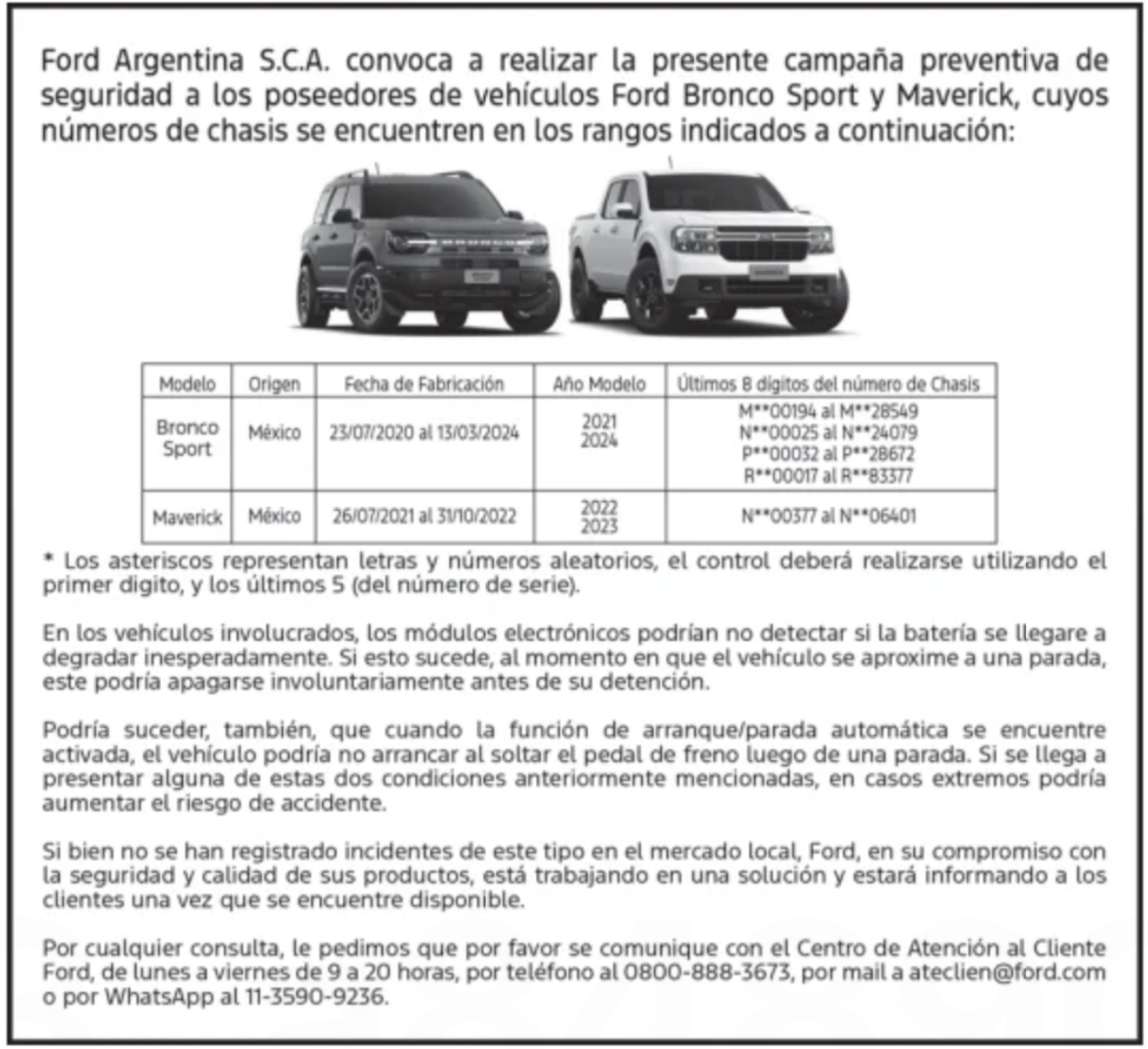Ford Argentina S.C.A. convoca a realizar la presente campaña preventiva de seguridad a los poseedores de vehículos Ford Bronco Sport y Maverick, cuyos números de chasis se encuentren en los rangos indicados a continuación: