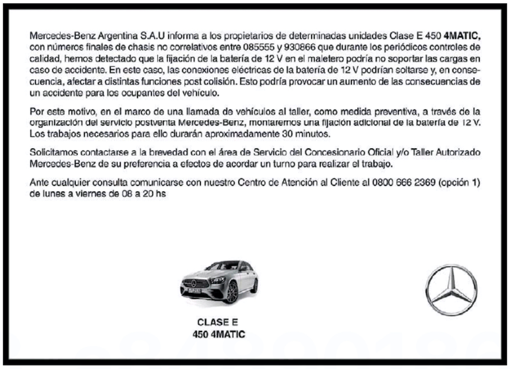 Mercedes-Benz Argentina S.A.U informa a los propietarios de determinadas unidades Clase E 450 4MATIC, con números finales de chasis no correlativos entre 085555 y 930866 que durante los periódicos controles de calidad, hemos detectado que la fijación de la batería de 12 V en el maletero podría no soportar las cargas en caso de accidente.