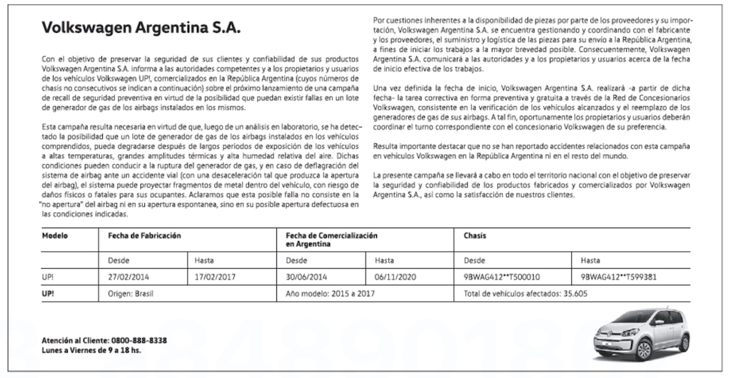 Con el objetivo de preservar la seguridad de sus clientes y confiabilidad de sus productos Volkswagen Argentina S.A. informa a las autoridades competentes y a los propietarios y usuarios de los vehículos Volkswagen UP!, comercializados en la República Argentina (cuyos números de chasis no consecutivos se indican a continuación) sobre el próximo lanzamiento de una campaña de recall de seguridad preventiva en virtud de la posibilidad que puedan existir fallas en un lote de generador de gas de los airbags instalados en los mismos.