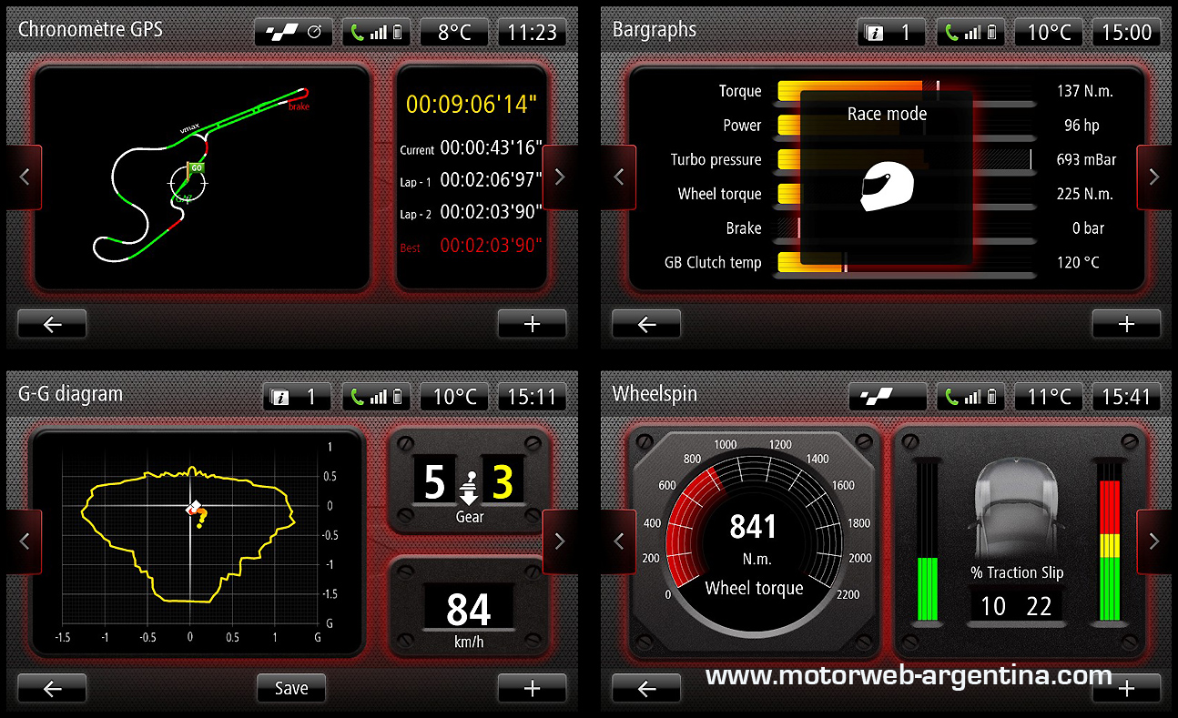 Ademas, en el monitor de la consola central, el «RS MONITOR» ofrece muchas funciones para seguir de cerca todo los pormenores del uso deportivo del auto. Cronometros, temperaturas de diferentes partes vitales, rendimientos, presión de turbo, torque, fuerza G, todo lo que a un entusiasta de la competición le gustará repasar luego de un uso «apasionado» de su Clio RS. Básicamente es un sistema muy completo y amigable de Telemetría que permite hacer data-logging y bajar todos los datos de uso del auto en un pendrive USB para verlo también en cualquier computadora.