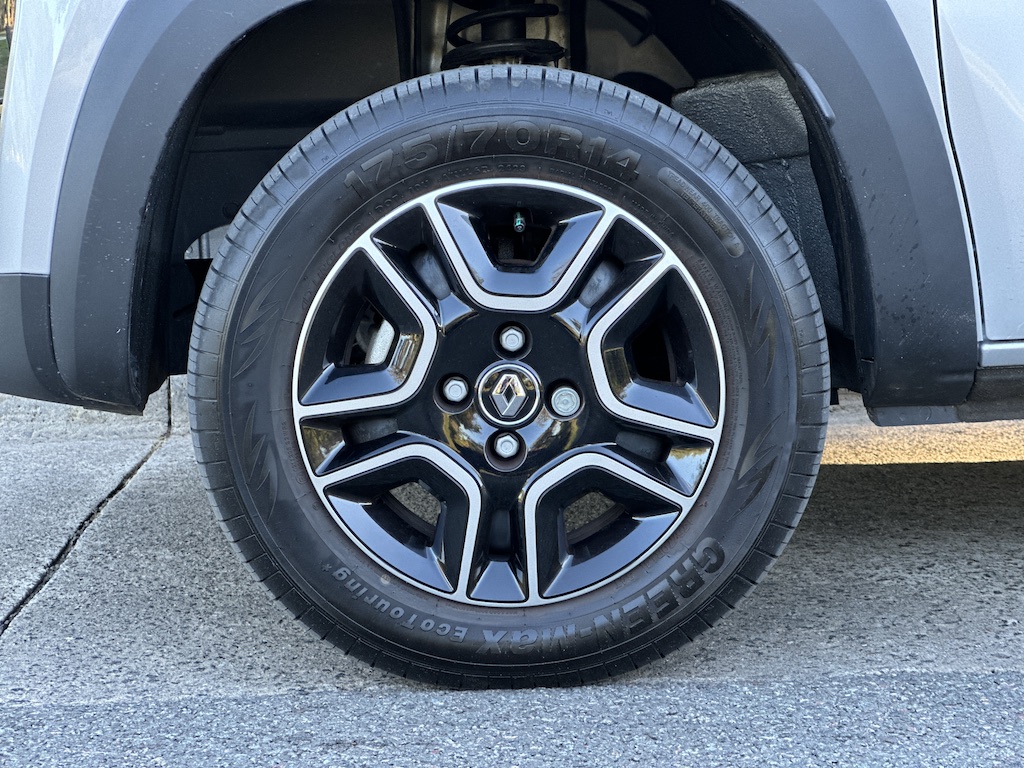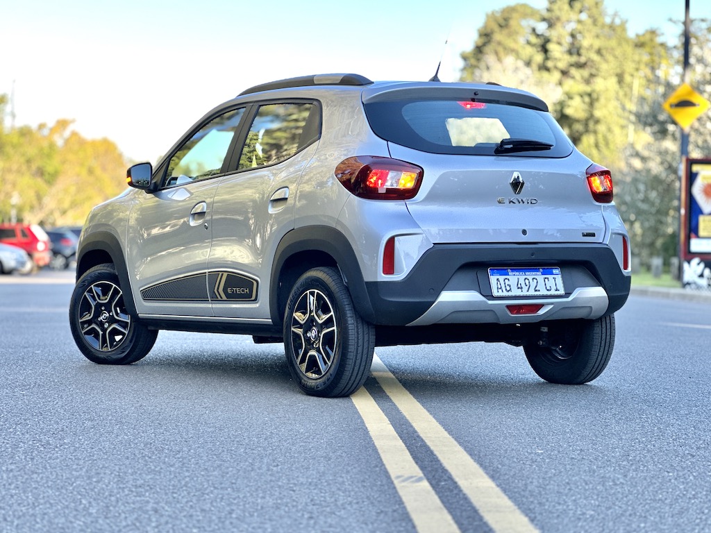 Poco tiene de novedoso el Kwid E-Tech en términos estéticos, más allá de estrenar una nueva máscara frontal, con luces de conducción diurna en LED. Los grupos ópticos son bipartidos, siendo las principales completamente halógenas. Mediante un comando interno la grilla frontal se levanta, dando lugar a los dos dos toma corriente disponibles en el auto. Cuenta con llantas de 14 pulgadas con llantas de chapa y embellecedores, y al contrario del Kwid regional (ya discontinuado en Argentina) cuenta con cuatro bulones por rueda.
