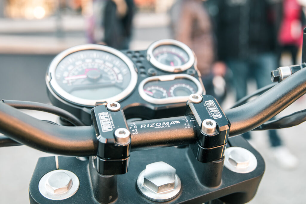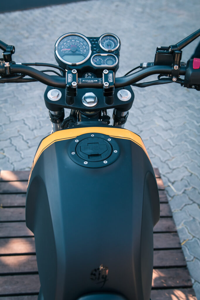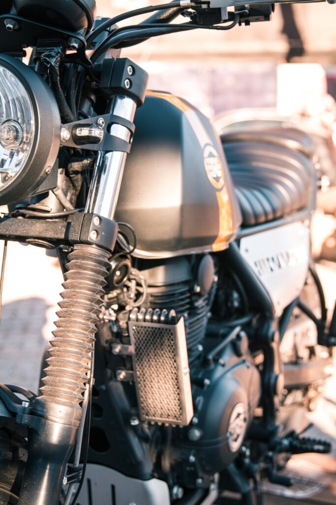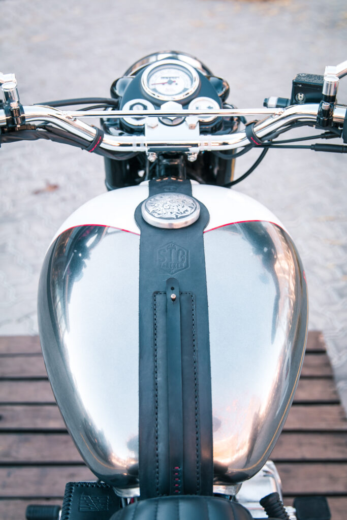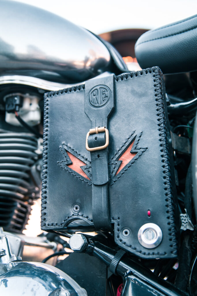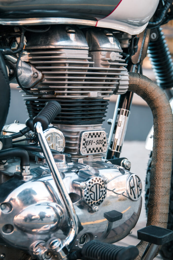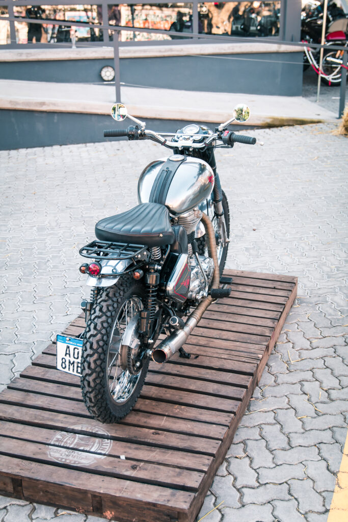En el caso de la Classic 500, se utilizó como inspiración una versión Scrambler del modelo que había sido lanzada por la década del ‘60 y el cambio con la moto de serie es más radical: Asiento más bajo, nuevo guardabarros trasero en aluminio con un soporte portaequipajes que incluye un asiento desmontable, pintura bicolor en el tanque de aluminio, cubiertas con tacos, nuevo manubrio y una simpática rejilla en la óptica delantera; no dejamos de lado el trabajo artesanal en la tapa del tanque de nafta, el motor y el escape; junto con el trabajo en talabartería realizado en el cubre batería y en todos los precintos de cables.