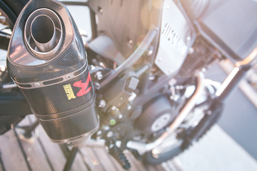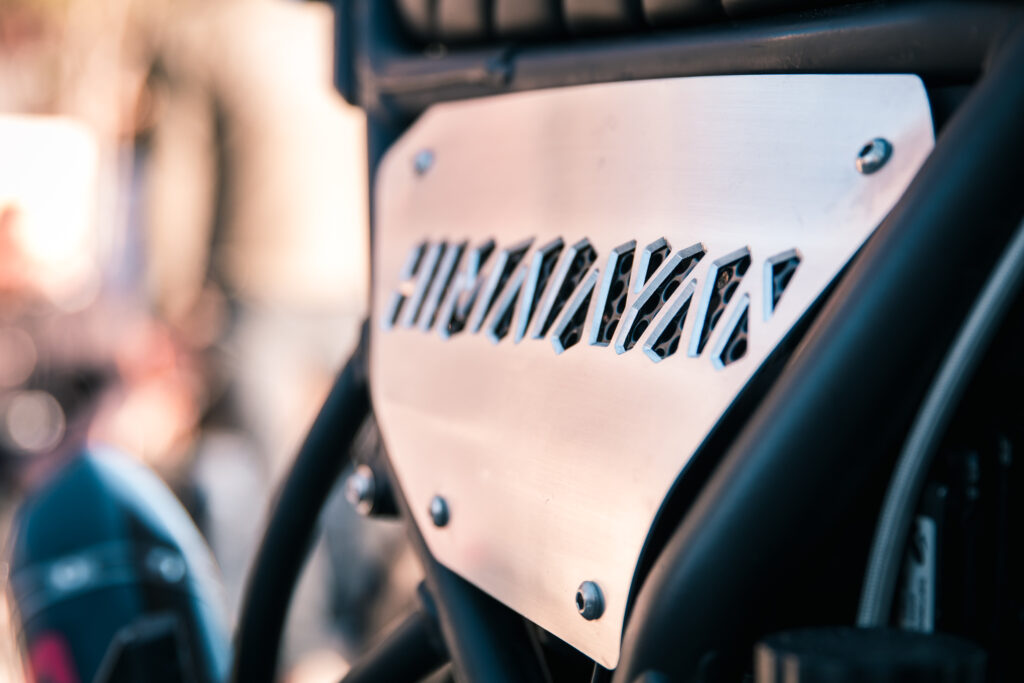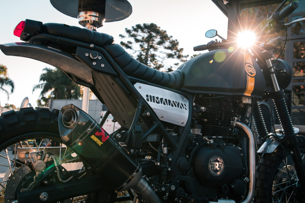Arrancando por la Himalayan, la primer diferencia notable está en el tanque, donde se ha descartado el protector del mismo que también cumplía función sosteniendo la óptica delantera, pero sin dudas lo que más llama la atención es el escape Akrapovic seguido por las cachas laterales con la identificación del modelo que han pasado de plástico a aluminio mecanizado en CNC, junto al cubrecadena realizados por el conocido artesano Castelli, conocido ganador de AFF. La parte trasera de la moto ha quedado más armónica, al cambiar el guardabarros por uno de aluminio y descartar los soportes para los valijones que trae de serie, también se le han agregado nuevos faroles traseros. Para la parte delantera, un nuevo soporte de óptica junto al guardabarros delantero también en aluminio completan el rediseño.