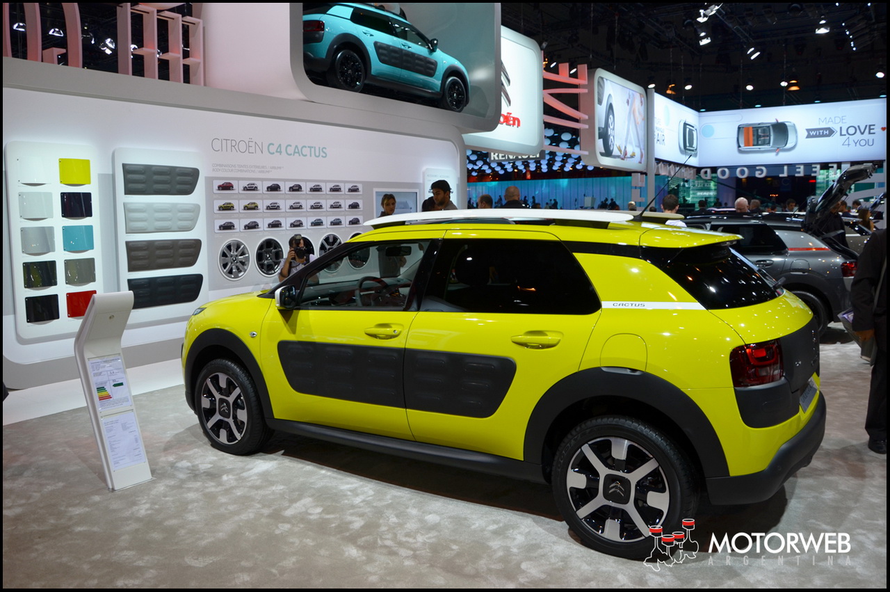 El nuevo Citroën C4 Cactus llega por primera vez al Salón de París en pleno lanzamiento comercial. Citroën ofrece una alternativa real a las berlinas compactas del segmento C. En un segmento muy concurrido, en el que parece que todo está inventado, el Citroën C4 Cactus sienta las bases de una nueva forma de entender automóvil, al dar más valor a aquello que cuenta de verdad para el cliente. Un diseño único que conjuga estética y funcionalidad, con unas superficies depuradas y lisas y volúmenes fluidos, sin ángulos agresivos. Unos volúmenes protegidos por elementos gráficos que sugieren el universo propio de los crossovers, entre los que destacan los «Airbump», una exclusiva Citroën.