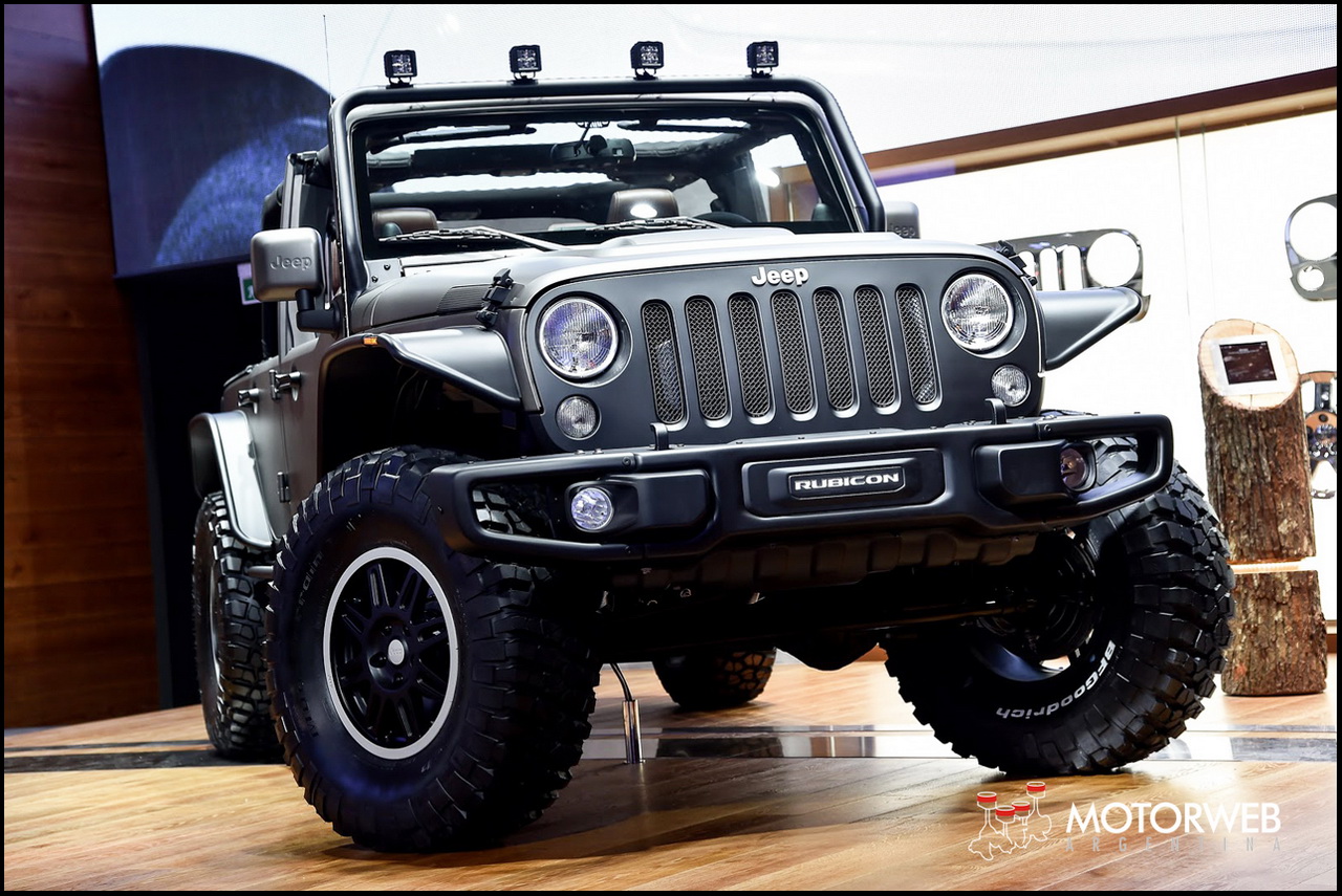 JEEP Salon Paris 2014 Motorweb 37En el Salón de París también se expone otro vehículo “moparizado”: el Jeep Wrangler Unlimited Rubicon “Stealth” equipado con el turbodiésel 2,8 litros de 200 CV y con accesorios originales Mopar. Se trata de una modificación técnica extrema (para las rutas todoterreno más exigentes) y estética, donde ningún detalle se pasa por alto: desde el capot de la linea Performance con tomas de aire, adornado con la parrilla de malla negra, hasta la nueva barra de luces de LED. Los paragolpes originales fueron sustituidos por los dos paragolpes  todoterreno (diseño Rubicon X) y, además de los guardabarros planos, los estribos, el kit de elevación y los neumáticos de 37 pulgadas transforman el Rubicon Stealth en un imparable ejemplar todoterreno de siete ranuras.