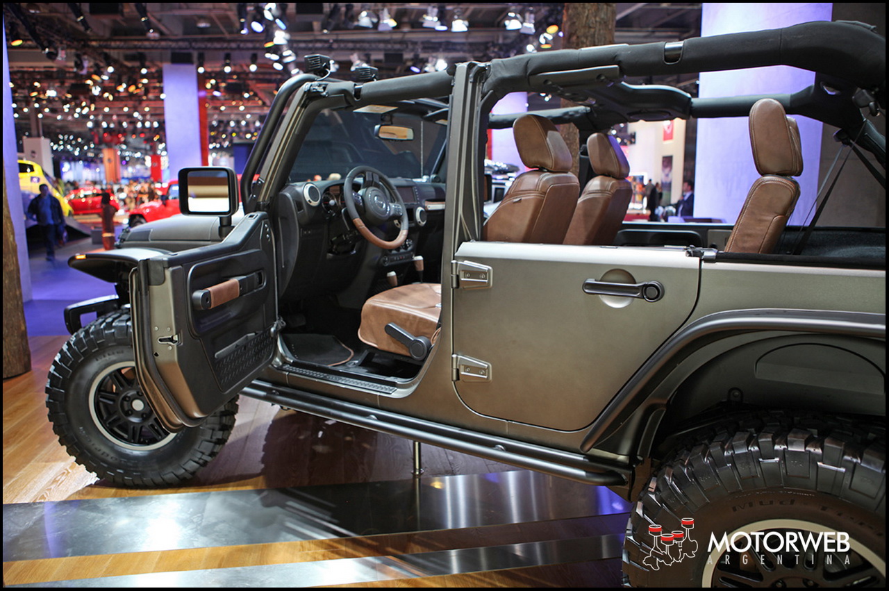JEEP Salon Paris 2014 Motorweb 01Las tapas de los retrovisores y la tapa del tanque de nafta con logo Jeep, las medias puertas y las llantas de 17″ son otros toques de personalización que los entusiastas de la marca sabrán apreciar.  Por último, pero no menos importante, el show car presenta una configuración estética (fruto de la colaboración entre la marca Jeep, Mopar y el Centro Stile de Fiat Chrysler Automobiles) que lo hace absolutamente único: de hecho, la carrocería exterior cuenta con una pintura texturizada Iron Peltrox de efecto oxidado, mientras que el exclusivo interior se equipa con asientos y componentes revestidos en piel estilo vintage.