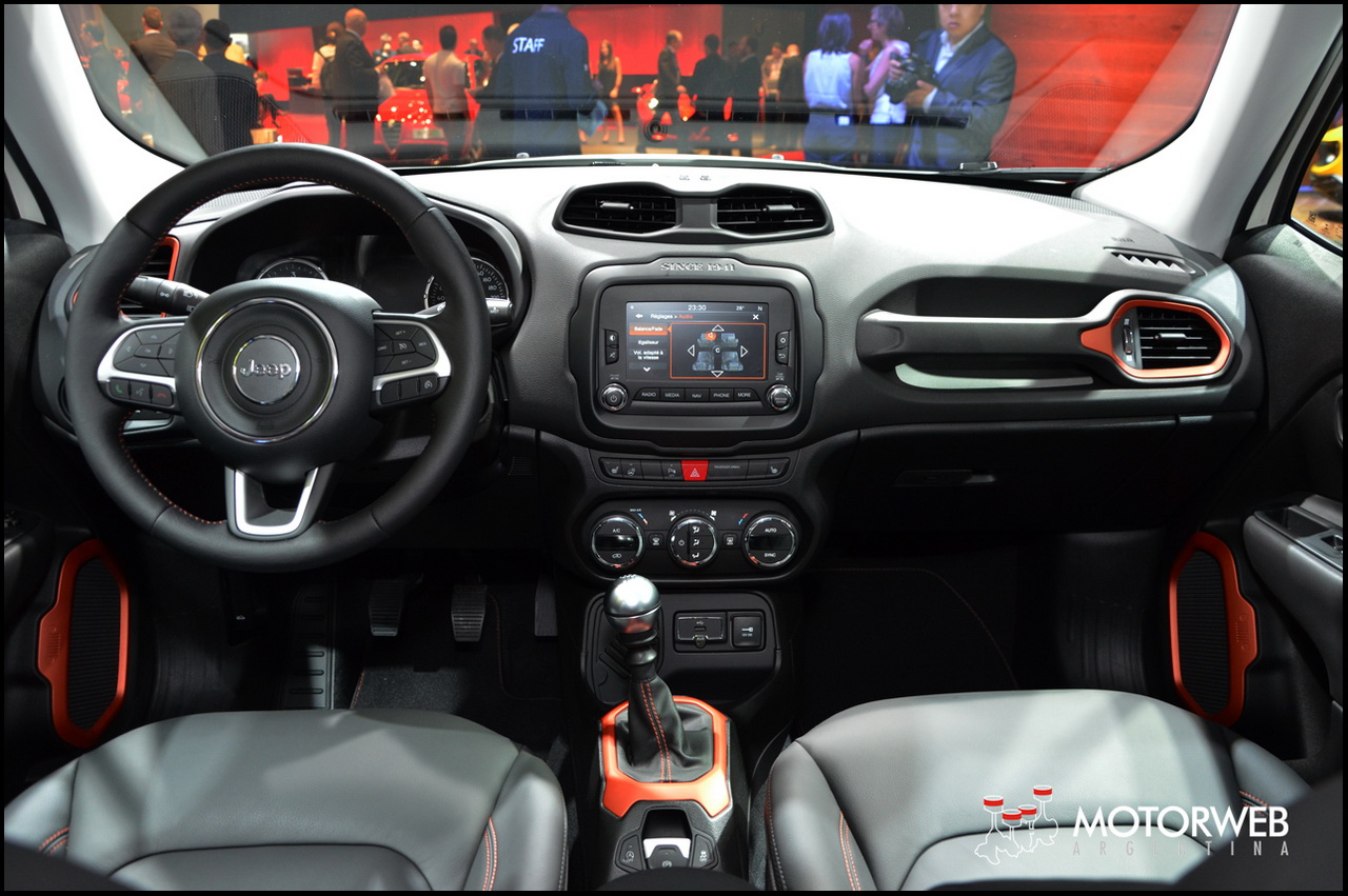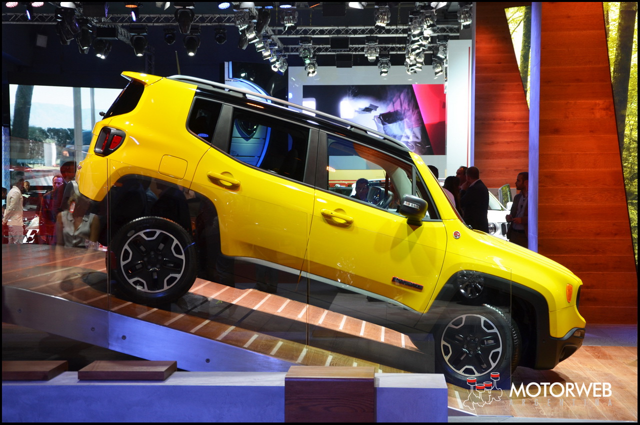 JEEP Salon Paris 2014 Motorweb 21El Jeep Renegade Trailhawk, el máximo representante en términos de prestaciones y caracterización todoterreno gracias al sistema de tracción total Jeep Active Drive Low, que luce una carrocería en Amarillo Baja y un interior en cuero negro. Se equipa con el eficiente motor turbodiésel de 2,0 litros y 170 CV de potencia combinado con el cambio automático de nueve velocidades.