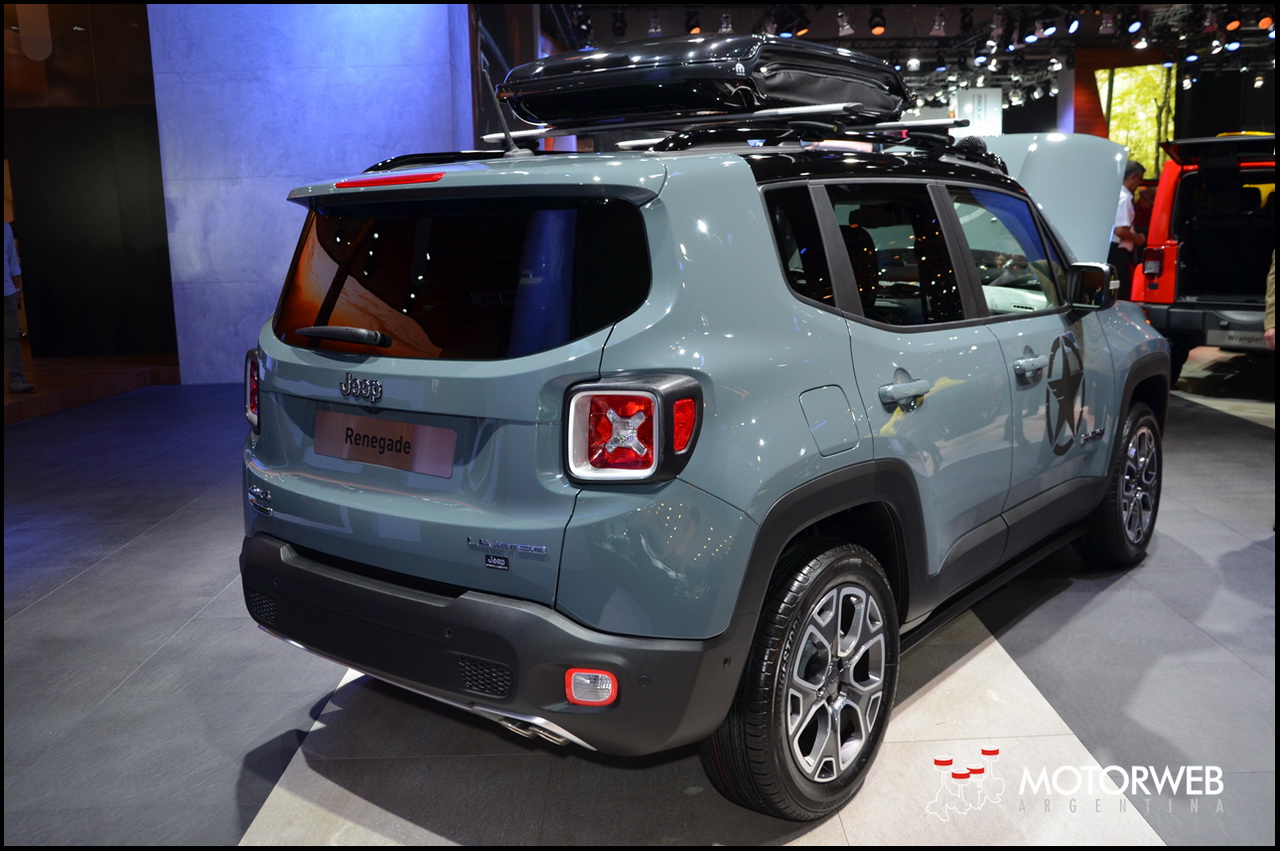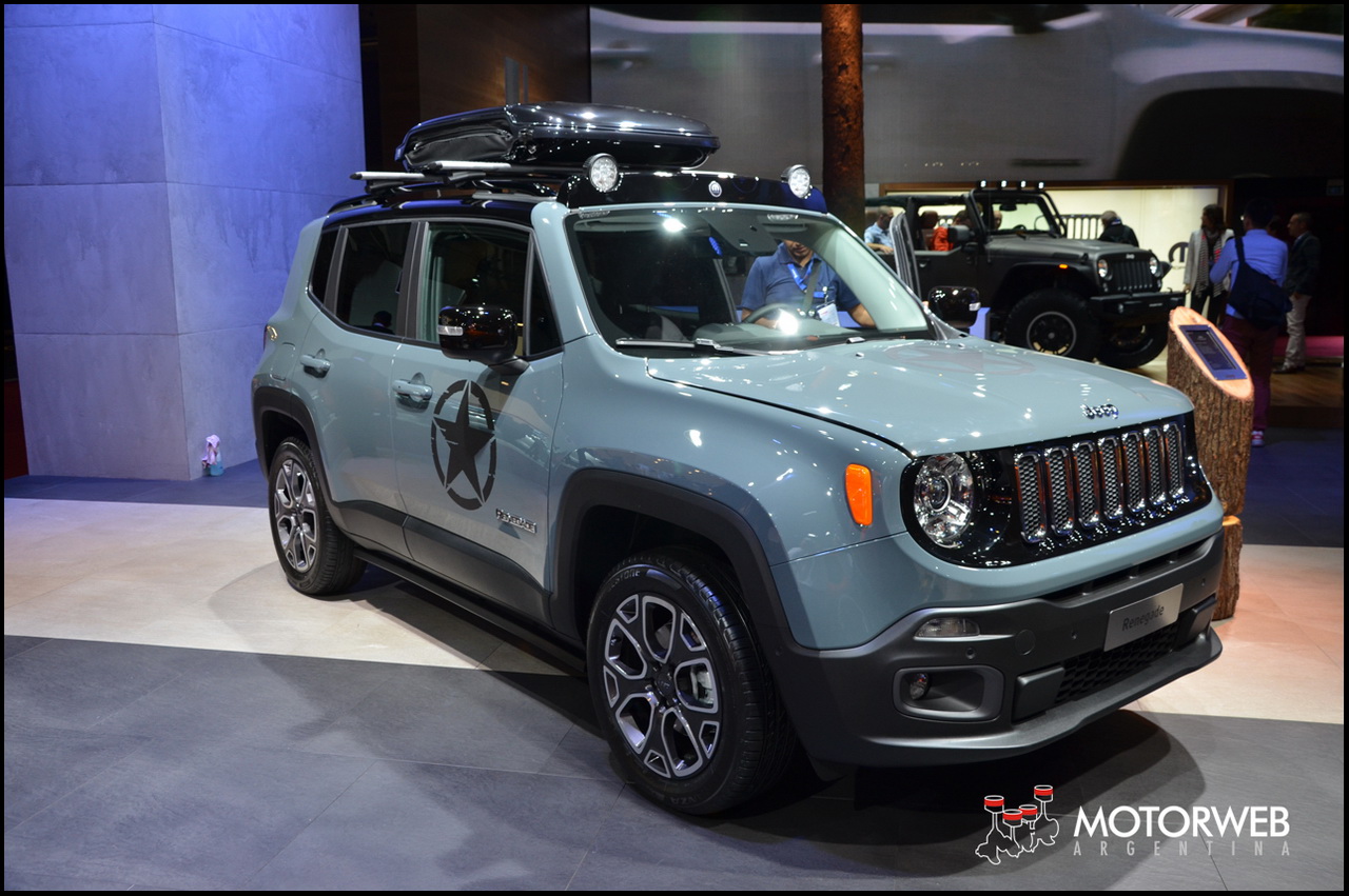 JEEP Salon Paris 2014 Motorweb 17A su lado, una versión Limited 2.0 MultiJet II de 140 CV equipada con algunos accesorios de la nueva colección de Mopar, como la estrella “US Army” en el capó y las puertas laterales, el elegante tratamiento en negro Gloss de la parrilla y las tapas de los retrovisores, las barras de techo, la barra de luces «Renegade Style” y el cofre de techo ampliable. Completan el vehículo las alfombras textiles color negro, las cantoneras con el logo Jeep, los estribos laterales tubulares y los tapones de los neumáticos con el logo Jeep.