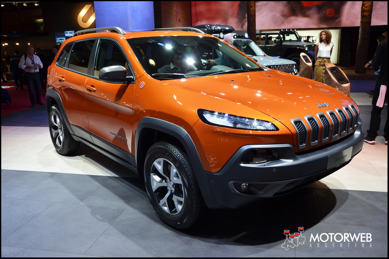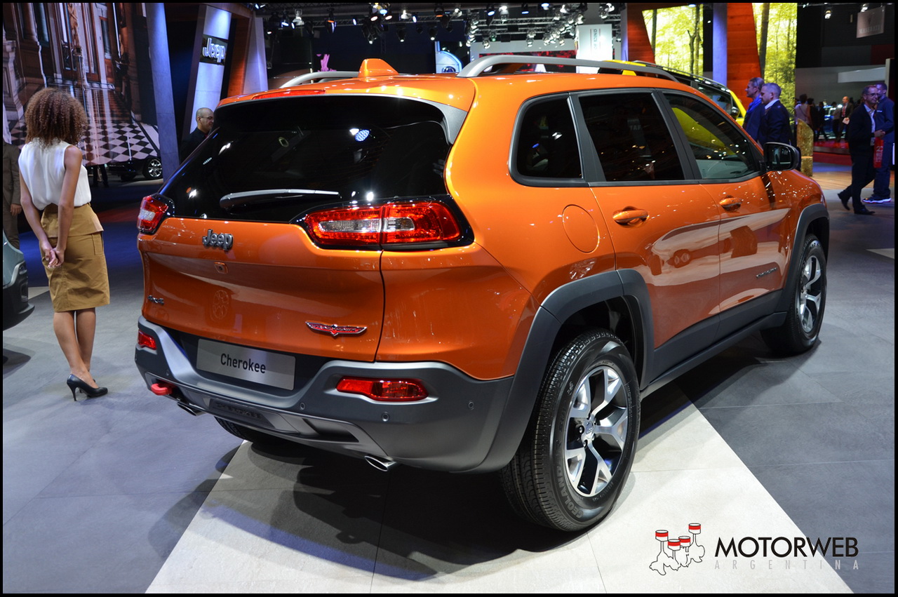 JEEP Salon Paris 2014 Motorweb 20También se expone la nueva generación del SUV de tamaño medio Jeep Cherokee con tres ejemplares – Longitude,  Limited y Trailhawk. Con su particular diseño de trompa que tanto ha dado que hablar, el Cherokee Trailhawk expuesto en color naranja «Mango Tango»  y un interior negro, estaba equipado con el potente motor V6 Pentastar naftero de 3,2 litros y 271 CV de potencia combinado, con el nuevo cambio automático de nueve velocidades.