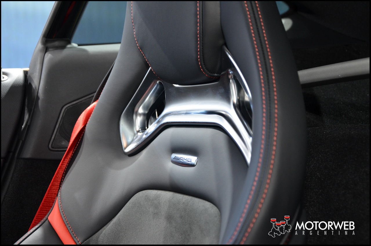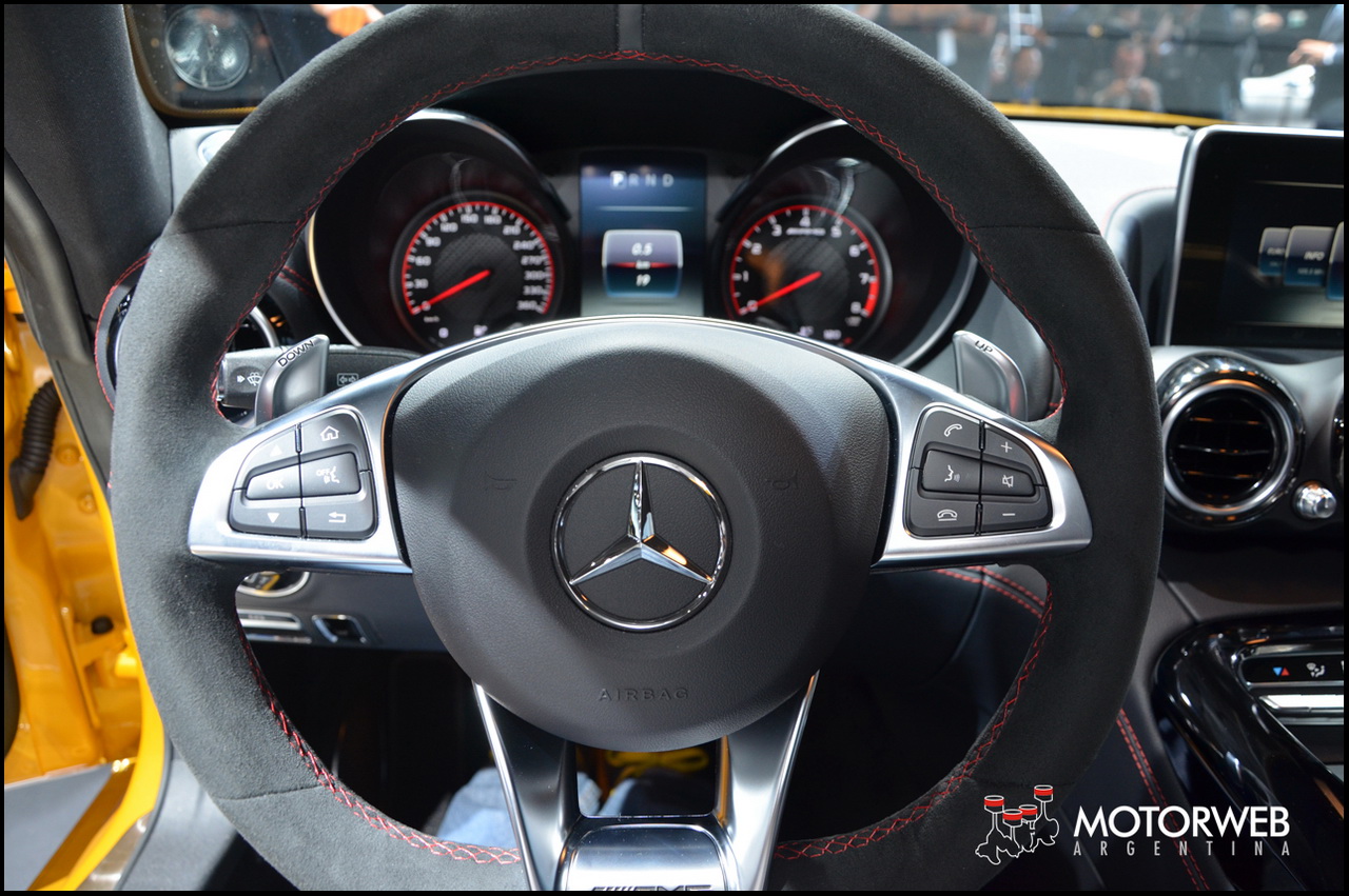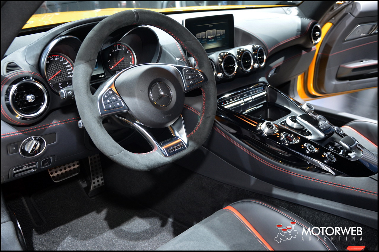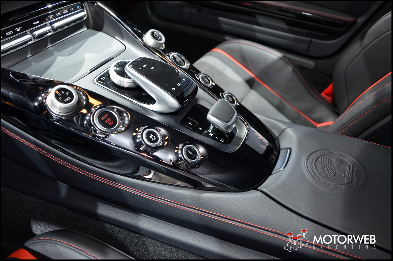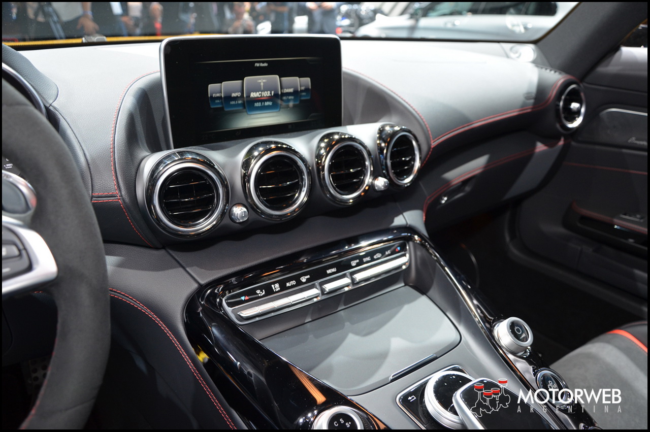 En el interior, la dominante consola central con sus formas inspiradas en las tomas de aire de aviación de tipo NACA, anuncia que estamos frente a un superdeportivo. Para el acabado de la consola el cliente podrá elegir entre cromo plateado, fibra de carbono mate, fibra de carbono brillante, Black Diamond y fibra de vidrio en plata mate. El display central exento está instalado de modo que parece flotar en el . El cuidado de todos los detalles se muestra también en los mandos de la AMG DRIVE UNIT. Están dispuestos en V, y según lo que nos contaron en el Stand de Mercedes, emulan la disposición de un motor de ocho cilindros, y subrayan los rasgos de la consola central.