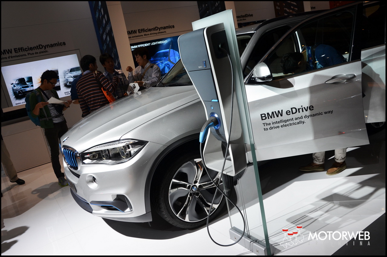 El BMW Concept X5 eDrive que estaba expuesto en París, muestra una forma innovadora de reducir aún más el consumo y las emisiones de un Sports Activity Vehicle, cada vez mas señalados en el Viejo Mundo por el tema de las emisiones contaminantes. Este conceptcar conjuga la practicidad de un vehiculo con tracción total xDrive, con un ambiente lujoso y un sistema propulsor híbrido tipo «plug-in» (enchufable). Esta combinación redunda en un automóvil que dispone de la deportividad típica de la marca, que permite conducir a una velocidad de hasta 120 km/h únicamente con el motor eléctrico y que, además, brilla con un consumo promedio según ciclo de pruebas UE de apenas 3,8 litros a los 100 kilómetros. El sistema propulsor está compuesto por un motor naftero de cuatro cilindros con tecnología BMW TwinPower Turbo y un motor eléctrico. La batería de ión-litio del concept-car puede recargarse de manera rápida y segura en cualquier toma de corriente doméstica o en una BMW i Wallbox, como se ve en la foto.