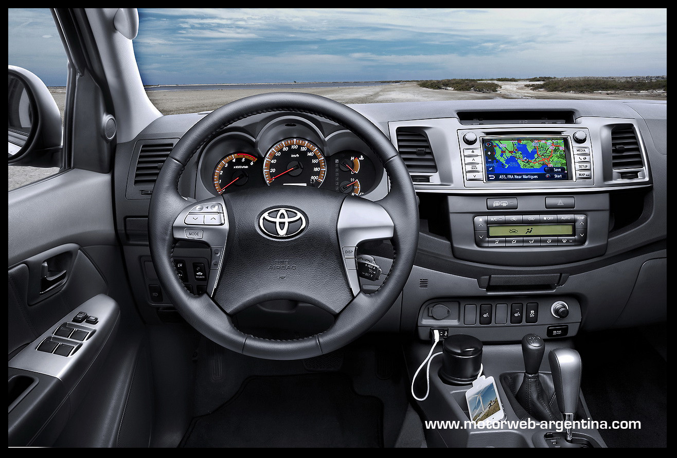 Tanto el diseño interior como el exterior del Hilux 2012 se han renovado extensamente. Los cambios del interior incluyen una mayor calidad percibida en todo el habitáculo, así como una comodidad similar a la de un auto. Un nuevo cuadro de mandos central horizontal refuerza la amplitud y el espacio del habitáculo. El cuadro central está dividido claramente en dos secciones. La parte superior incorpora una unidad multimedia con pantalla táctil Toyota Touch de 6,1”, que supuestamente también estará disponible en Argentina, según nos han informado algunas fuentes. La parte inferior integra nuevos diseños para los controles del aire acondicionado y el climatizador automático. El cuadro de mandos del conductor se ha rediseñado para potenciar la claridad de los indicadores, y las versiones más completas cuentan ahora con indicadores Optitron. El volante, con un nuevo diseño más moderno, incorpora el cambio de marchas en función de la versión.