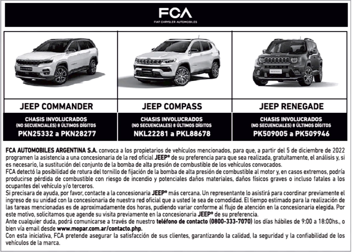 FCA AUTOMOBILES ARGENTINA S.A. convoca a los propietarios de vehículos mencionados, para que, a partir del 5 de diciembre de 2022 programen la asistencia a una concesionaria de la red oficial JEEP de su preferencia para que sea realizada, gratuitamente, el análisis y, si es necesario, la sustitución del conjunto de la bomba de alta presión de combustible de los vehículos convocados.